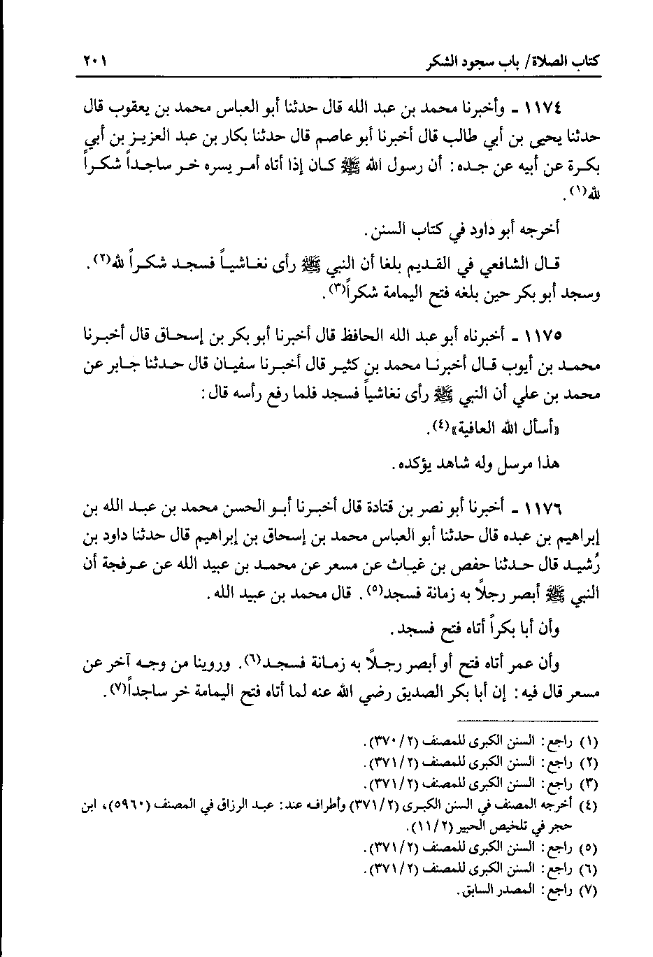 1174 - وأخبرنا محمد بن عبد الله قال حدثنا أبو العباس محمد بن يعقوب قال حدثنا يحيى بن أبي طالب قال اخبرنا أبو عاصم قال حدثنا بكار بن عبد العزيز بن أبي بكرة عن أبيه عن جده : أن رسول الله صلى الله عليه وسلم كان إذا اتاه أمر يسره خر ساجدا شكرا لله.