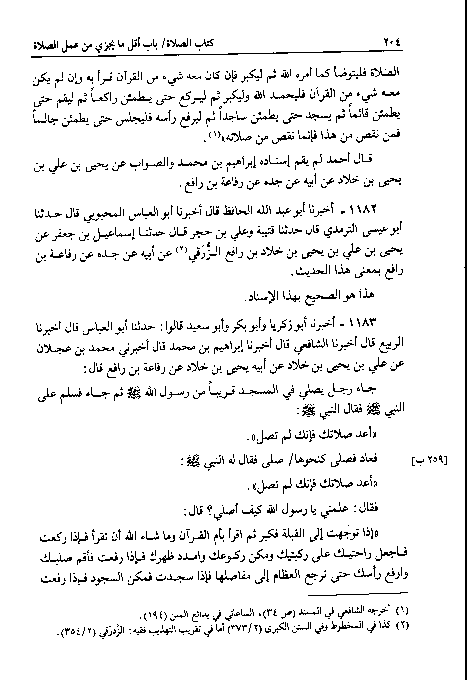 1183 - أخبرنا أبو زكريا وأبو بكر وأبو سعيد قالوا : حدثنا أبو العباس قال اخبرنا الربيع قال اخبرنا الشافعي قال اخبرنا إبراهيم بن محمد قال اخبرني محمد بن عجلان عن علي بن يحيى بن خلاد عن أبيه يحيى بن خلاد عن رفاعة بن رافع قال : جاء رجل يصلي في المسجد قريبا من رسول الله صلى الله عليه وسلم ثم جاء فسلم على النبي صلى الله عليه وسلم فقال النبي صلى الله عليه وسلم : أعد صلاتك فإنك لم تصل.