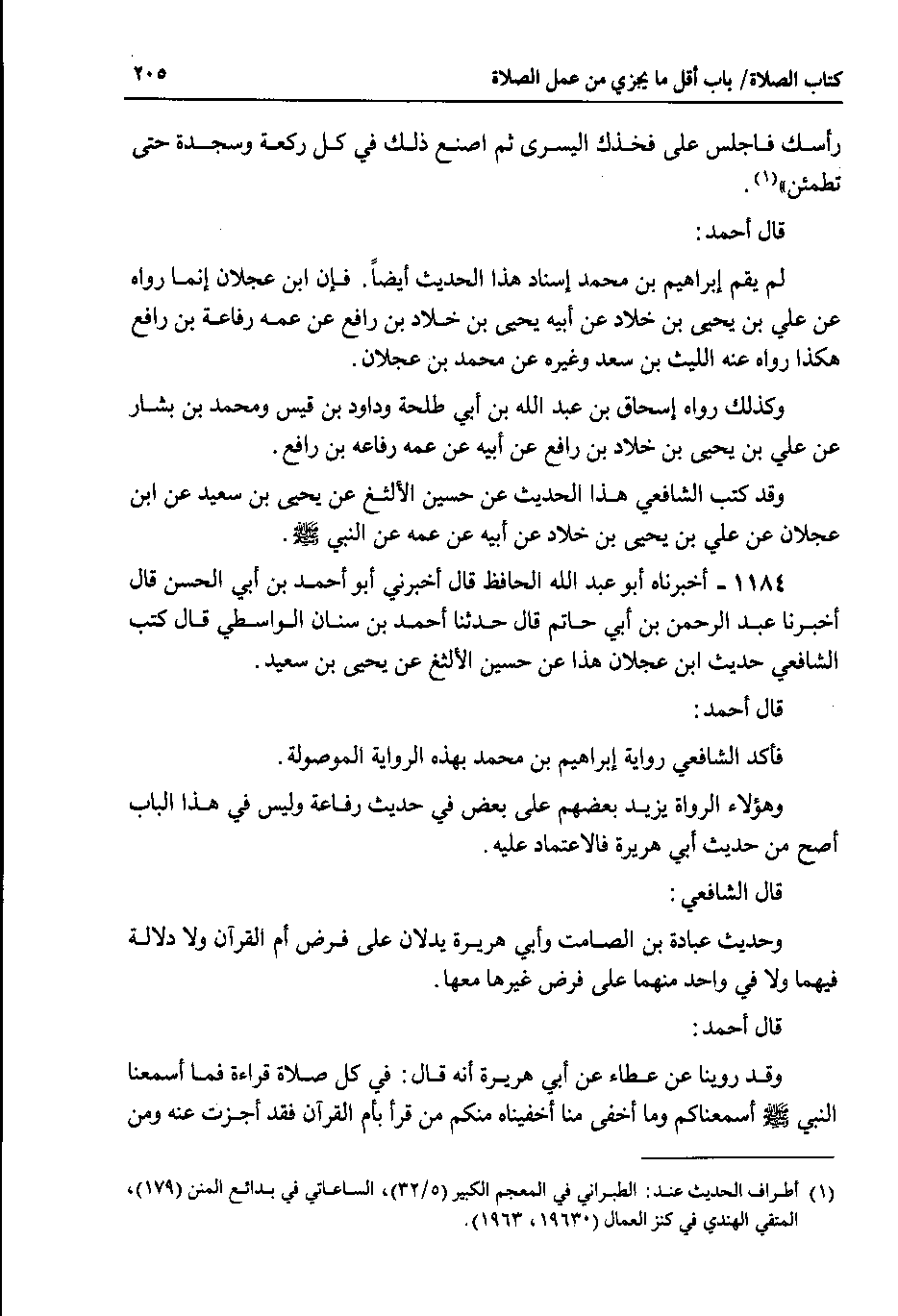 قال أحمد : لم يقم إبراهيم بن محمد إسناد هذا الحديث أيضا . فإن ابن عجلان إنما رواه عن علي بن يحيى بن خلاد عن أبيه يحيى بن خلاد بن رافع عن عمه رفاعة بن رافع هكذا رواه عنه الليث بن سعد وغيره عن محمد بن عجلان.