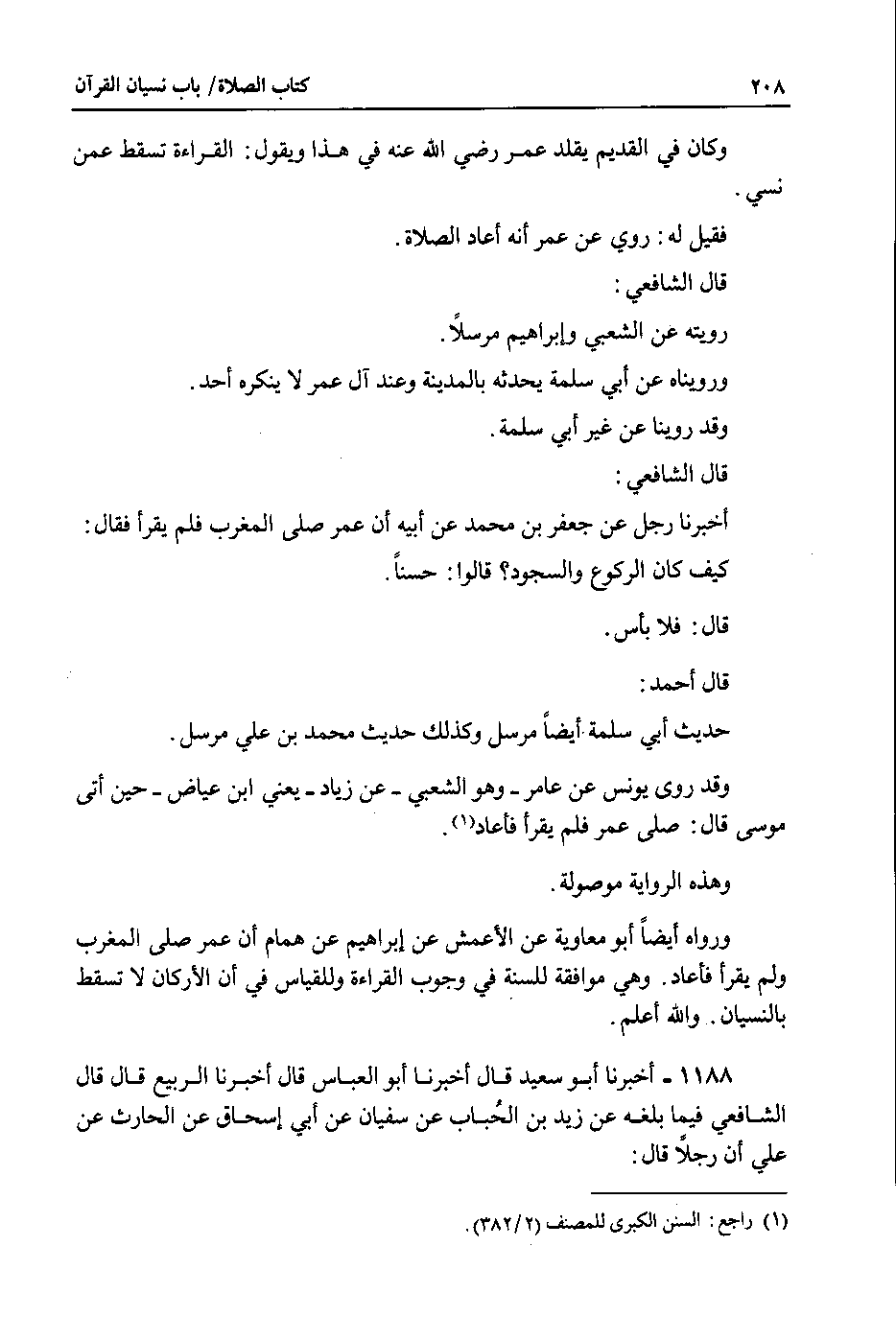 ورواه أيضا أبو معاوية عن الأعمش عن إبراهيم عن همام أن عمر صلى المغرب ولم يقرأ فأعاد . وهي موافقة للسنة في وجوب القراءة وللقياس في أن الأركان لا تسقط بالنسيان . والله أعلم.