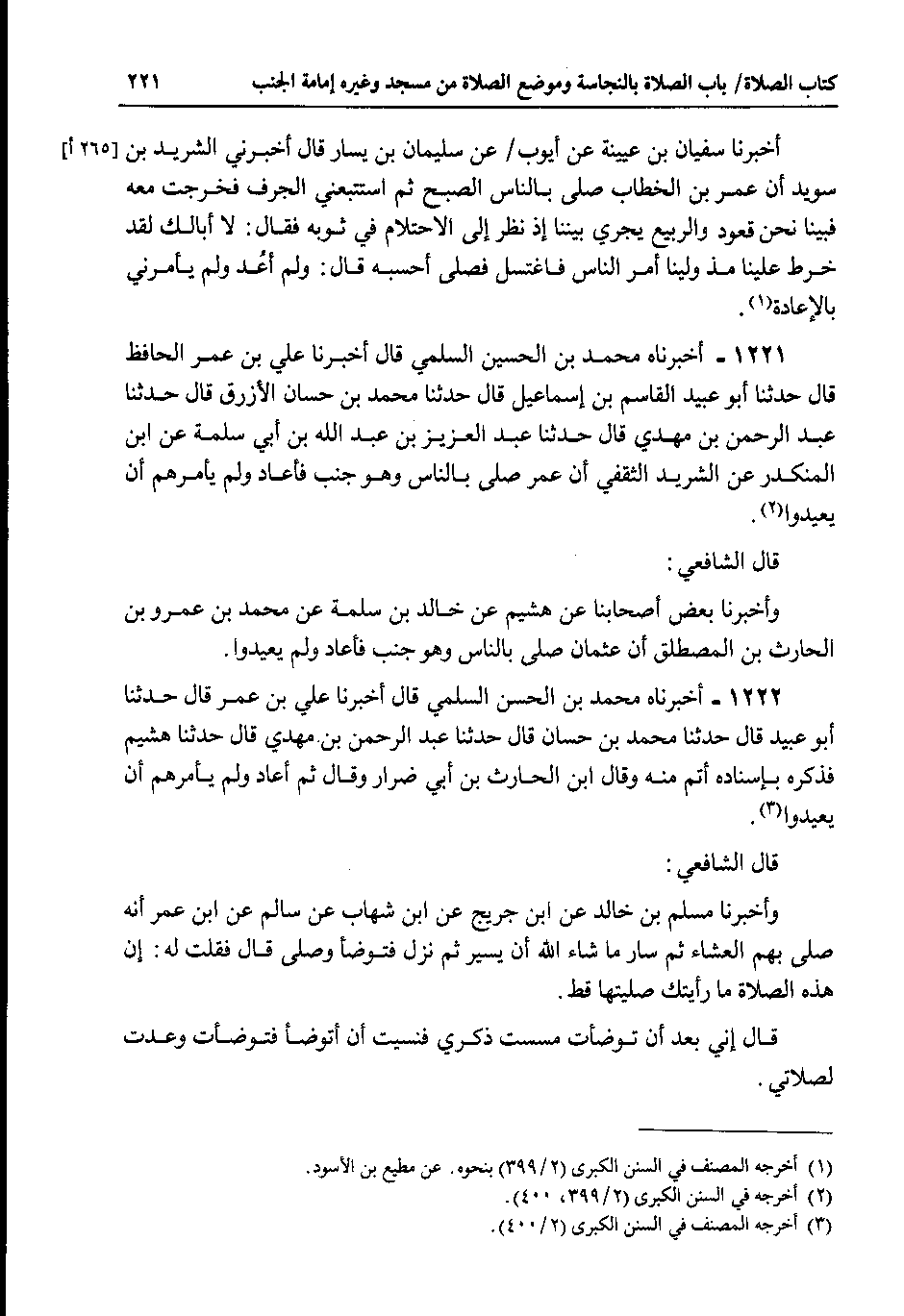1221 - أخبرناه محمد بن الحسين السلمي قال أخبرنا علي بن عمر الحافظ قال حدثنا أبو عبيد القاسم بن إسماعيل قال حدثنا محمد بن حسان الأزرق قال حدثنا عبد الرحمن بن مهدي قال حدثنا عبد العزيز بن عبد الله بن أبي سلمة عن ابن المنكدر عن الشريد الثقفي أن عمر صلى بالناس وهوجنب فأعاد ولم يأمرهم أن يعيدوا.