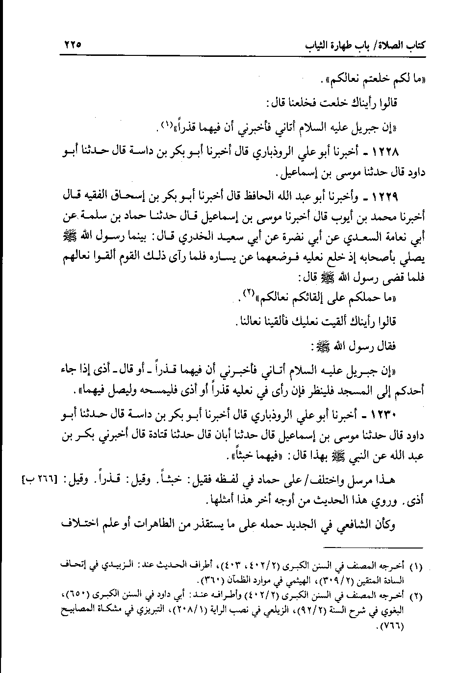 1229 - واخبرنا أبو عبد الله الحافظ قال أخبرنا أبو بكر بن إسحاق الفقيه قال اخبرنا محمد بن أيوب قال أخبرنا موسى بن إسماعيل قال حدثنا حماد بن سلمة عن أبي نعامة السعدي عن أبي نضرة عن أبي سعيد الخدري قال : بينما رسول الله صلى الله عليه وسلم يصلي بأصحابه إذ خلع نعليه فوضعهما عن يساره فلما رآى ذلك ألقوم القوا نعالهم فلما قضى رسول الله صلى الله عليه وسلم قال : ما حملكم على إلقائكم نعالكم.