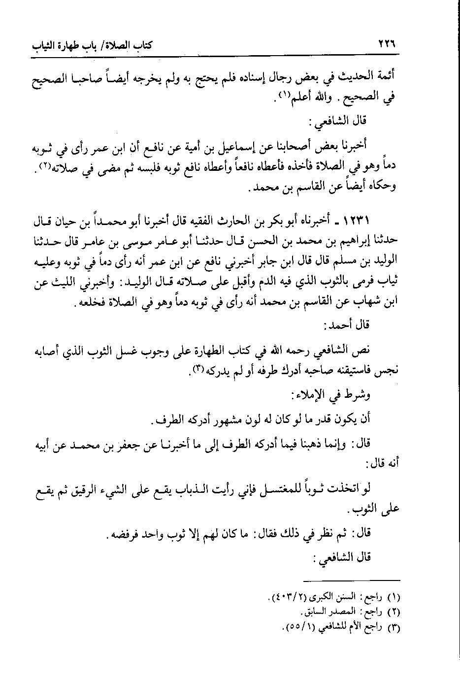 1231 - أخبرناه أبو بكر بن الحارث الفقيه قال أخبرنا أبو محمدا بن حيان قال حدثنا إبراهيم بن محمد بن الحسن قال حدثنا أبو عامر موسى بن عامر قال حدثنا الوليد بن مسلم قال قال ابن جابر اخبرني نافع عن ابن عمر انه رأى دما في ثوبه وعليه ثياب فرمى بالثوب الذي فيه الدم واقبل على صلاته قال الوليد : وأخبرني الليث عن ابن شهاب عن القاسم بن محمد انه رأى في ثوبه دما وهو في الصلاة فخلعه.