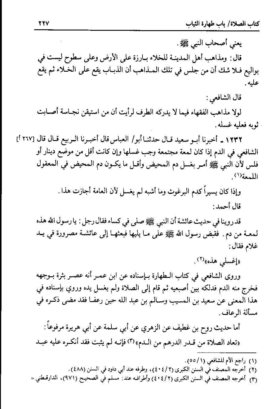 1232 - أخبرنا أبو سعيد قال حدثنا أبو العباس قال أخبرنا الربيع قال قال الشافعي في الدم إذا كان لمعة مجتمعة وجب غسلها وإن كانت أقل من موضع دينار أو فلس لأن النبي صلى الله عليه وسلم أمر بغسل دم المحيض وأقل ما يكون دم المحيض في المعقول اللمعة.