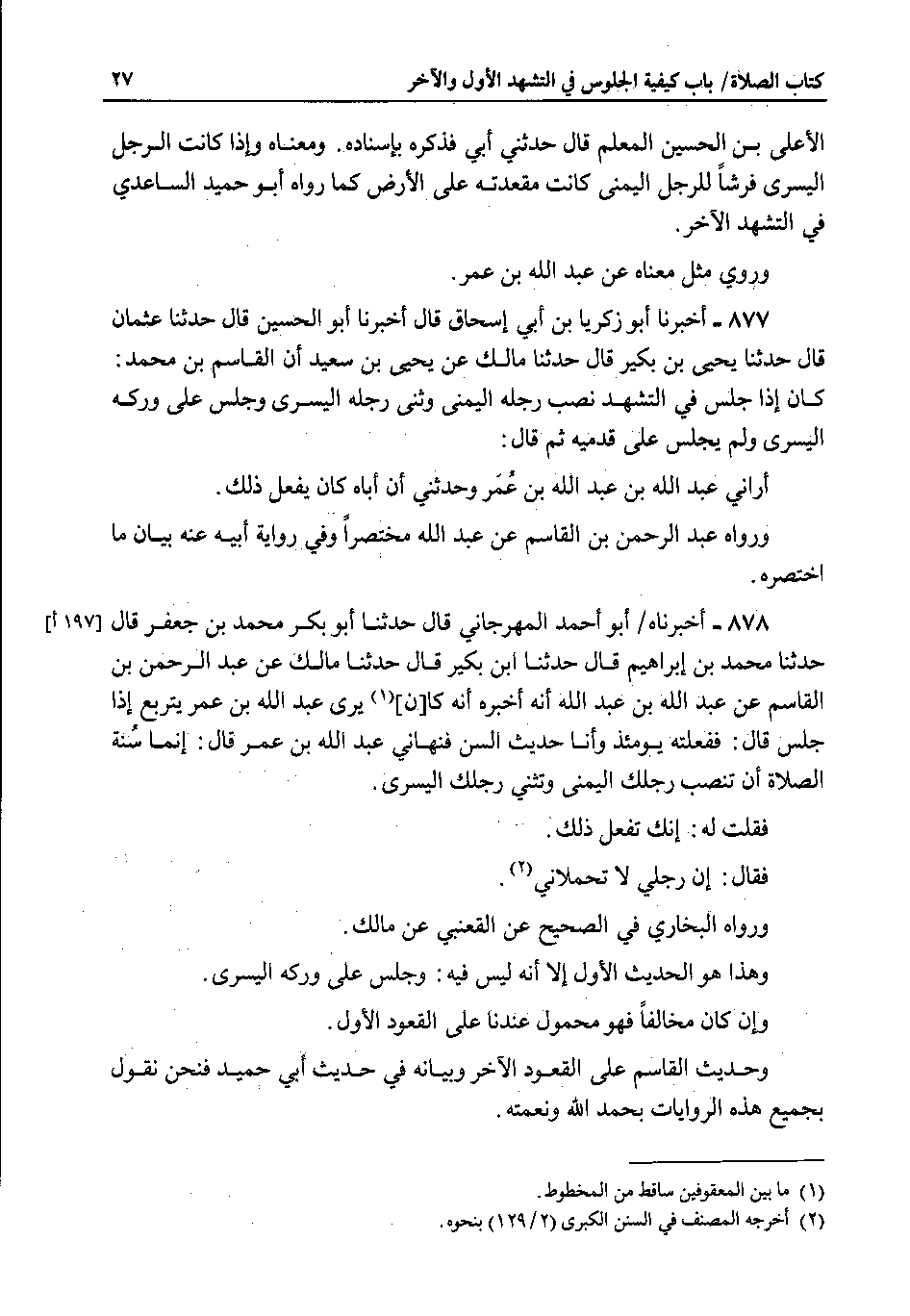 877 - أخبرنا أبو زكريا بن أبي إسحاق قال اخبرنا أبو الحسين قال حدثنا عثمان قال حدثنا يحيى بن بكير قال حدثنا مالك عن يحيى بن سعيد أن القاسم بن محمد : كان إذا جلس في التشهد نصب رجله اليمنى وثنى رجله اليسرى وجلس على وركه اليسرى ولم يجلس على قدميه ثم قال : أراني عبد الله بن عبد الله بن عمر وحدثني أن أباه كان يفعل ذلك.