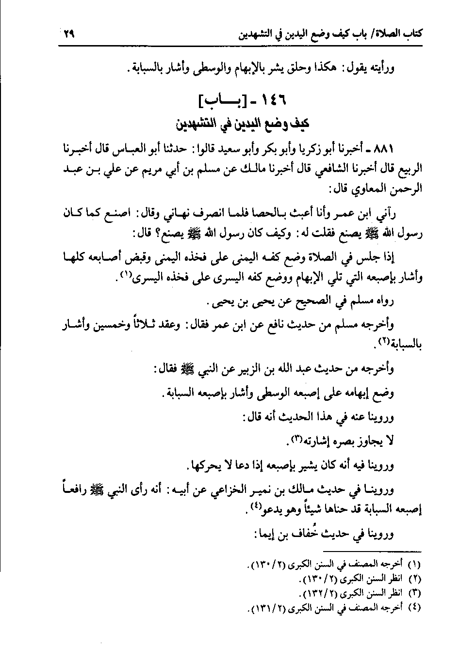 881 - أخبرنا أبو زكريا وأبو بكر وأبو سعيد قالوا : حدثنا أبو العباس قال اخبرنا الربيع قال أخبرنا الشافعي قال اخبرنا مالك عن مسلم بن أبي مريم عن علي بن عبد الرحمن المعاوي قال : رآني ابن عمر وأنا أعبث بالحصا فلما انصرف نهاني وقال : اصنع كما كان رسول الله صلى الله عليه وسلم يصنع فقلت له : ويكف كان رسول الله صلى الله عليه وسلم يصنع ؟ قال : إذا جلس في الصلاة وضع كفه اليمنى على فخذه اليمنى وقبض أصابعه كلها وأشار بإصبعه التي تلي الإبهام ووضع كفه اليسرى على فخذه اليسرى.