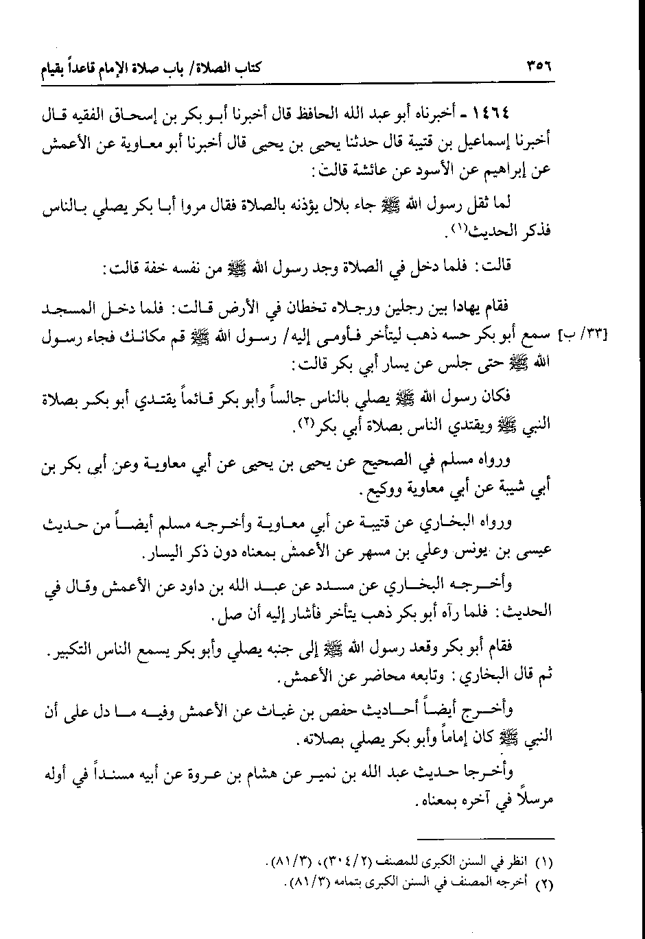1464 - أخبرناه أبو عبد الله الحافظ قال أخبرنا أبو بكر بن إسحاق الفقيه قال اخبرنا إسماعيل بن قتيبة قال حدثنا يحيى بن يحيى قال أخبرنا أبو معاوية عن الأعمش عن إبراهيم عن الأسود عن عائشة قالت : لما ثقل رسول الله صلى الله عليه وسلم جاء بلال يؤذنه بالصلاة فقال مروا أبا بكر يصلي بالناس فذكر الحديث.
