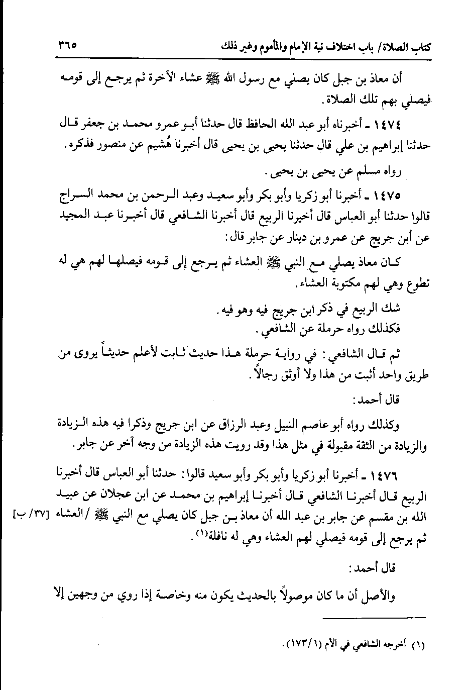 1475 - أخبرنا أبو زكريا وابو بكر وأبو سعيد وعبد الرحمن بن محمد السراج قالوا حدثنا أبو العباس قال أخبرنا الربيع قال أخبرنا الشافعي قال أخبرنا عبد المجيد عن ابن جريج عن عمرو بن دينار عن جابر قال : كان معاذ يصلي مع النبي صلى الله عليه وسلم العشاء ثم يرجع إلى قومه فيصلها لهم هي له تطوع وهي لهم مكتوبة العشاء.