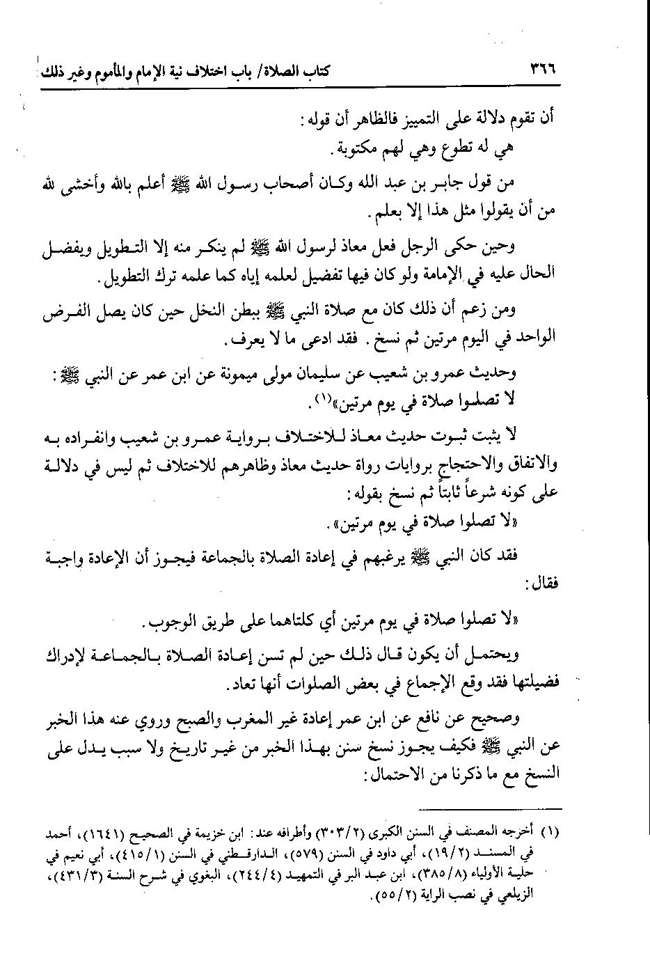 لا يثبت ثبوت حديث معاذ للاختلاف برواية عمرو بن شعيب وانفراده به والاتفاق والاحتجاج بروايات رواة حديث معاذ وظاهرهم للاختلاف ثم ليس في دلالة على كونه شرعا ثابتا ثم نسخ بقوله : لا تصلوا صلاة في يوم مرتين.