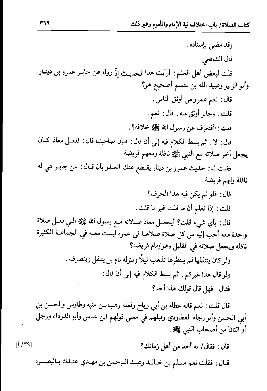 قلت : أفتعرف عن رسول الله صلى الله عليه وسلم خلافه ؟ قال : لا . ثم بسط الكلام فيه إلى أن قال : فإن صاحبنا قال : فلعل معاذا كان يجعل آخر صلاته مع النبي صلى الله عليه وسلم نافلة ومعهم فريضة.