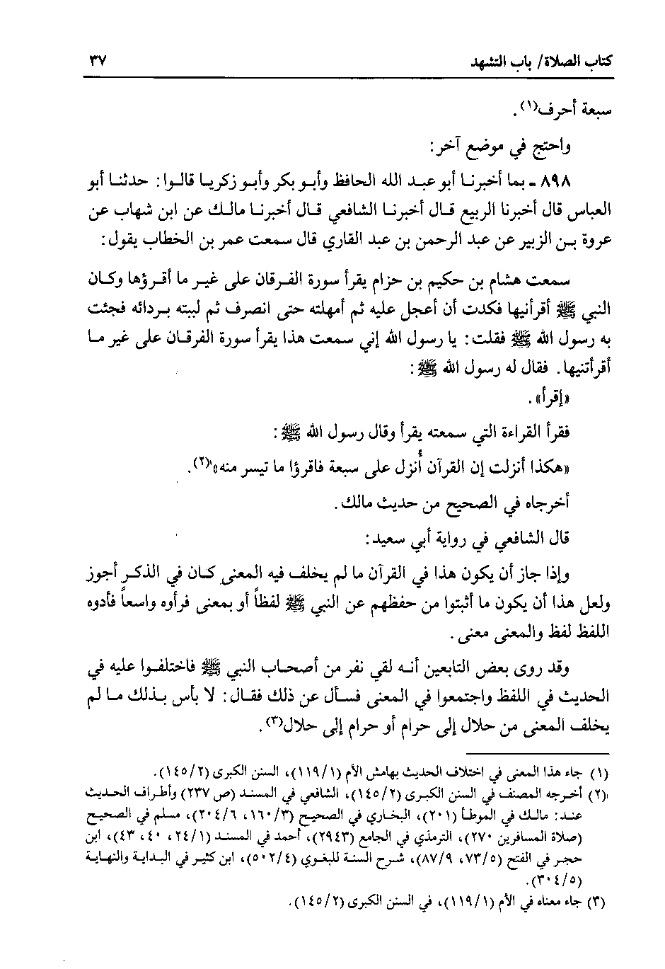 واحتج في موضع آخر 898 - بما اخبرنا أبو عبد الله الحافظ وابو بكر وأبو زكريا قالوا : حدثنا أبو العباس قال اخبرنا الربيع قال اخبرنا الشافعي قال اخبرنا مالك عن ابن شهاب عن عروة بن الزبير عن عبد الرحمن بن عبد القاري قال سمعت عمر بن الخطاب يقول : سمعت هشام بن حكيم بن حزام يقرأ سورة الفرقان على غير ما أقرؤها وكان النبي صلى الله عليه وسلم اقرانيها فكدت أن اعجل عليه ثم امهلته حتى انصرف ثم لببته برادئه فجئت به رسول الله صلى الله عليه وسلم فقلت : يا رسول الله إني سمعت هذا يقرأ سورة الفرقان على غير ما اقرأتنيها . فقال له رسول الله صلى الله عليه وسلم : إقرأ.