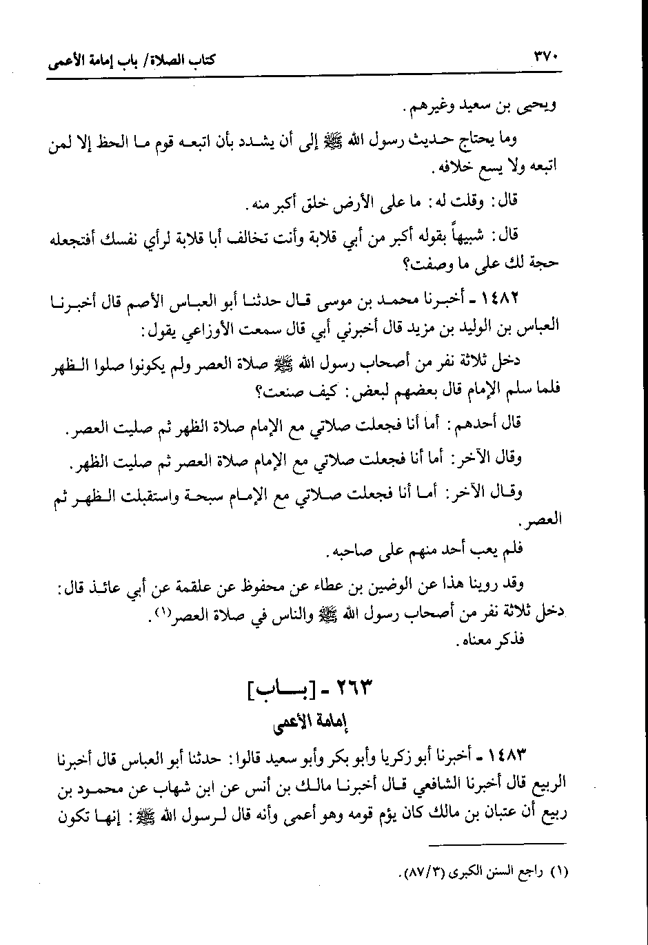 قال : شبيها بقوله اكبر من أبي قلابة وانت تخالف أبا قلابة لراي نفسك افتجعله حجة لك على ما وصفت ؟ 1482 - أخبرنا محمد بن موسى قال حدثنا أبو العباس الأصم قال أخبرنا العباس بن الوليد بن مزيد قال اخبرني أبي قال سمعت الاوزاعي يقول : دخل ثلاثة نفر من أصحاب رسول الله صلى الله عليه وسلم صلاة العصر ولم يكونوا صلوا الظهر فلما سلم الإمام قال بعضهم لبعض : كيف صنعت ؟ قال أحدهم : أما أنا فجعلت صلاتي مع الإمام صلاة الظهر ثم صليت العصر.