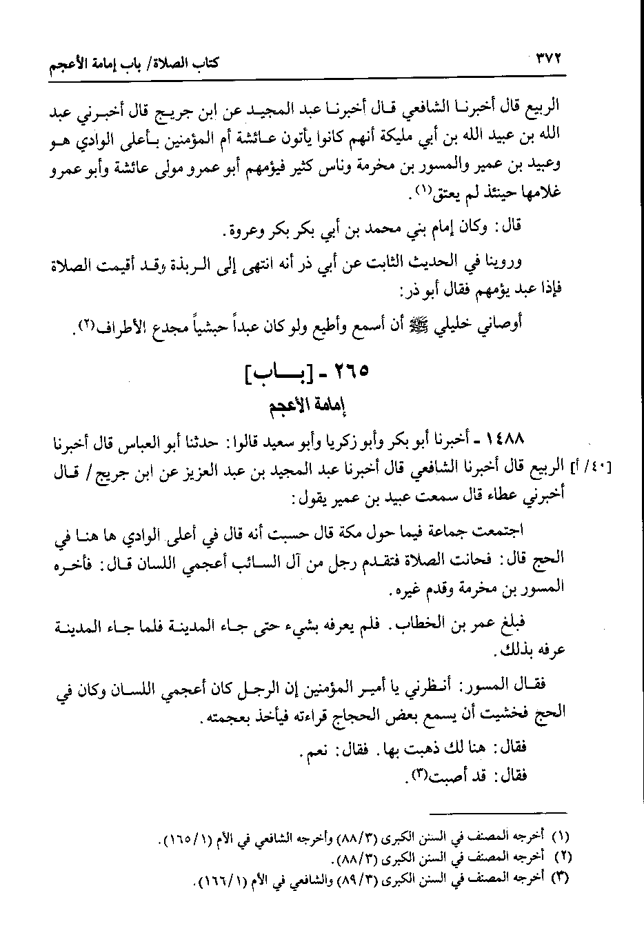 1488 - أخبرنا أبو بكر وأبو زكريا وأبو سعيد قالوا : حدثنا ابو العباس قال أخبرنا الربيع قال أخبرنا الشافعي قال أخبرنا عبد المجيد بن عبد العزيز عن ابن جريج قال اخبرني عطاء قال سمعت عبيد بن عمير يقول : اجتمعت جماعة فيما حول مكة قال حسبت انه قال في أعلى الوادي ها هنا في الحج قال : فحانت الصلاة فتقدم رجل من آل السائب اعجمي اللسان قال : فأخره المسور بن مخرمة وقدم غيره.