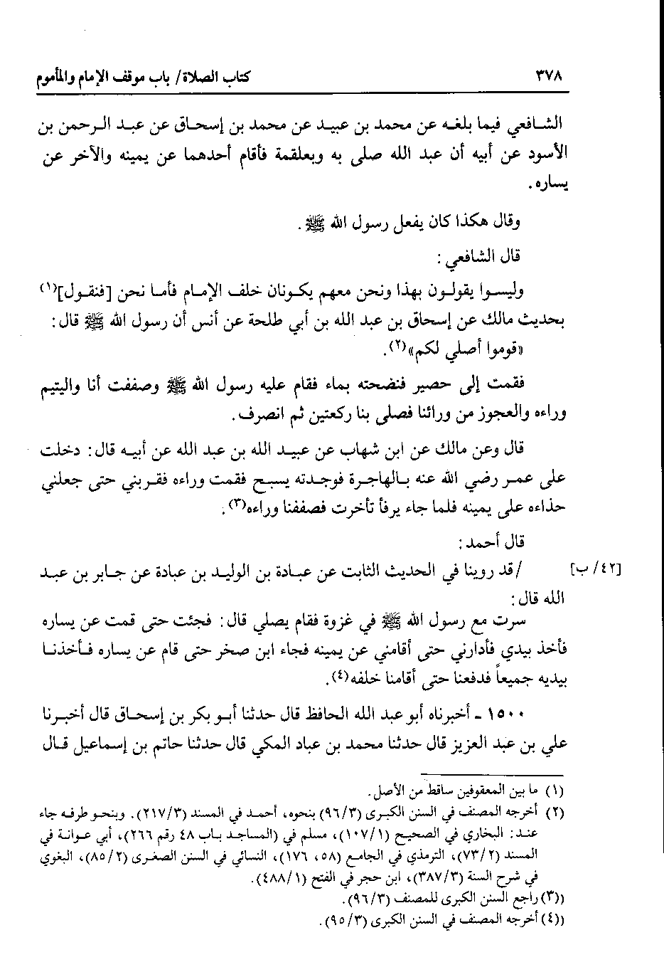 قال أحمد : قال روينا في الحديث الثابت عن عبادة بن الوليد بن عبادة عن جابر بن عبد الله قال : سرت مع رسول الله صلى الله عليه وسلم في غزوة فقام يصلي قال : فجئت حتى قمت عن يساره فأخذ بيدي فأدارني حتى أقامني عن يمينه فجاء ابن صخر حتى قام عن يساره فأخذنا بيديه جميعا فدفعنا حتى اقامنا خلفه.