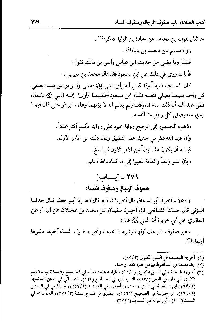 1501 - أخبرنا أبو إسحاق قال أخبرنا شافع قال أخبرنا أبو جعفر قال حدثنا المزني قال حدثنا الشافعي قال أخبرنا سفيان عن محمد بن عجلان عن أبيه أو عن المقبري عن أبي هريرة أن النبي صلى الله عليه وسلم قال : خير صفوف الرجال اولها وشرها آخرها وخير صفوف النساء آخرها وشرها اولها.