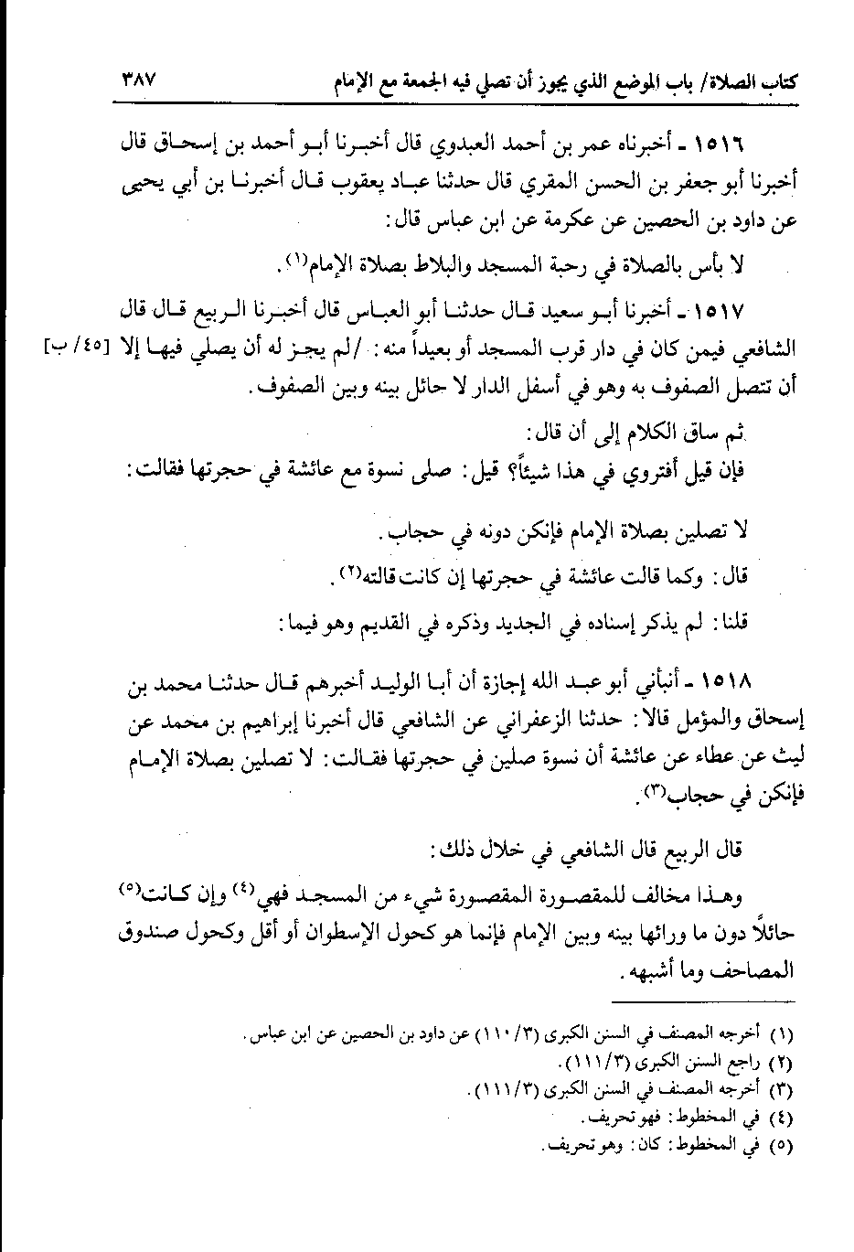 قلنا : لم يذكر إسناده في الجديد وذكره في القديم وهو فيما 1518 - انبأني أبو عبد الله إجازة أن أبا الوليد أخبرهم قال حدثنا محمد بن إسحاق والمؤمل قالا : حدثنا الزعفراني عن الشافعي قال أخبرنا إبراهيم بن محمد عن ليث عن عطاء عن عائشة أن نسوة صلين في حجرتها فقالت : لا تصلين بصلاة الإمام فإنكن في حجاب.