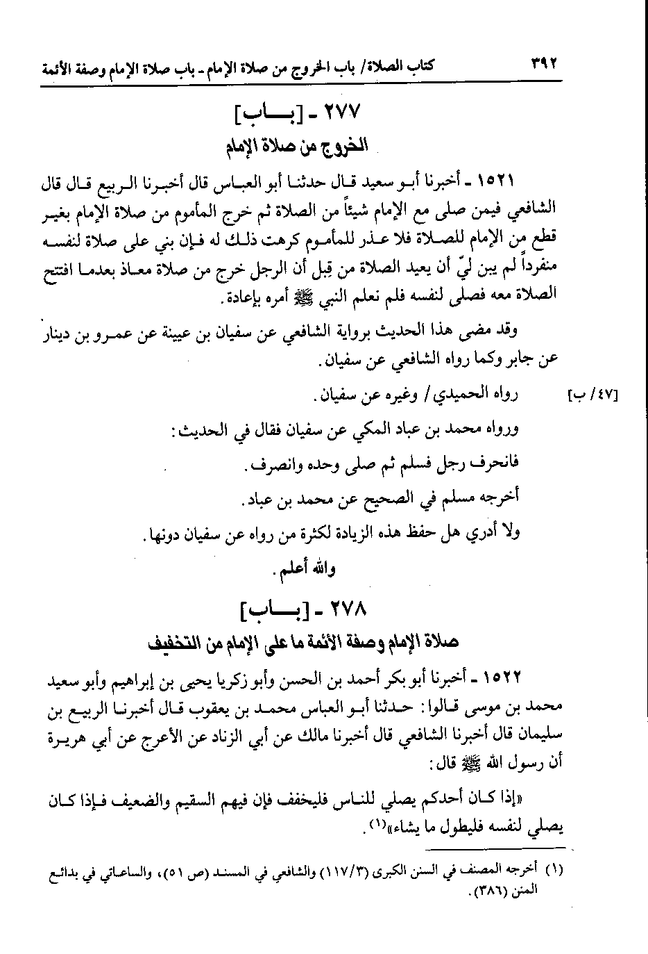 1522 - أخبرنا أبو بكر أحمد بن الحسن وأبو زكريا يحيى بن إبراهيم وأبو سعيد محمد بن موسى قالوا : حدثنا أبو العباس محمد بن يعقوب قال أخبرنا الربيع بن سليمان قال أخبرنا الشافعي قال أخبرنا مالك عن أبي الزناد عن الأعرج عن أبي هريرة أن رسول الله صلى الله عليه وسلم قال : إذا كان أحدكم يصلي للناس فليخفف فإن فيهم السقيم والضعيف فإذا كان يصلي لنفسه فليطول ما يشاء.