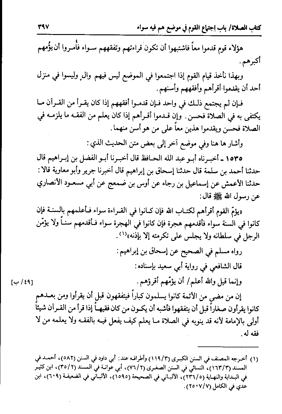 وأشار ها هنا وفي موضع آخر إلى بعض متن الحديث الذي 1535 - أخبرناه أبو عبد الله الحافظ قال أخبرنا أبو الفضل بن إبراهيم قال حدثنا أحمد بن سلمة قال حدثنا اسحاق بن ابراهيم قال اخبرنا جرير وابو معاوية قالا حدثنا الأعمش عن إسماعيل بن رجاء عن اوس بن ضمعج عن أبي مسعود الأنصاري عن رسول الله صلى الله عليه وسلم قال : يؤم القوم اقراهم لكتاب الله فإن كانوا في القراءة سواء فأعلمهم بالسنة فإن كانوا في السنة سواء فأقدمهم هجرة فإن كانوا في الهجرة سواء فأقدمهم سنا ولا يؤمن الرجل في سلطانه ولا يجلس على تكرمته إلا بإذنه.