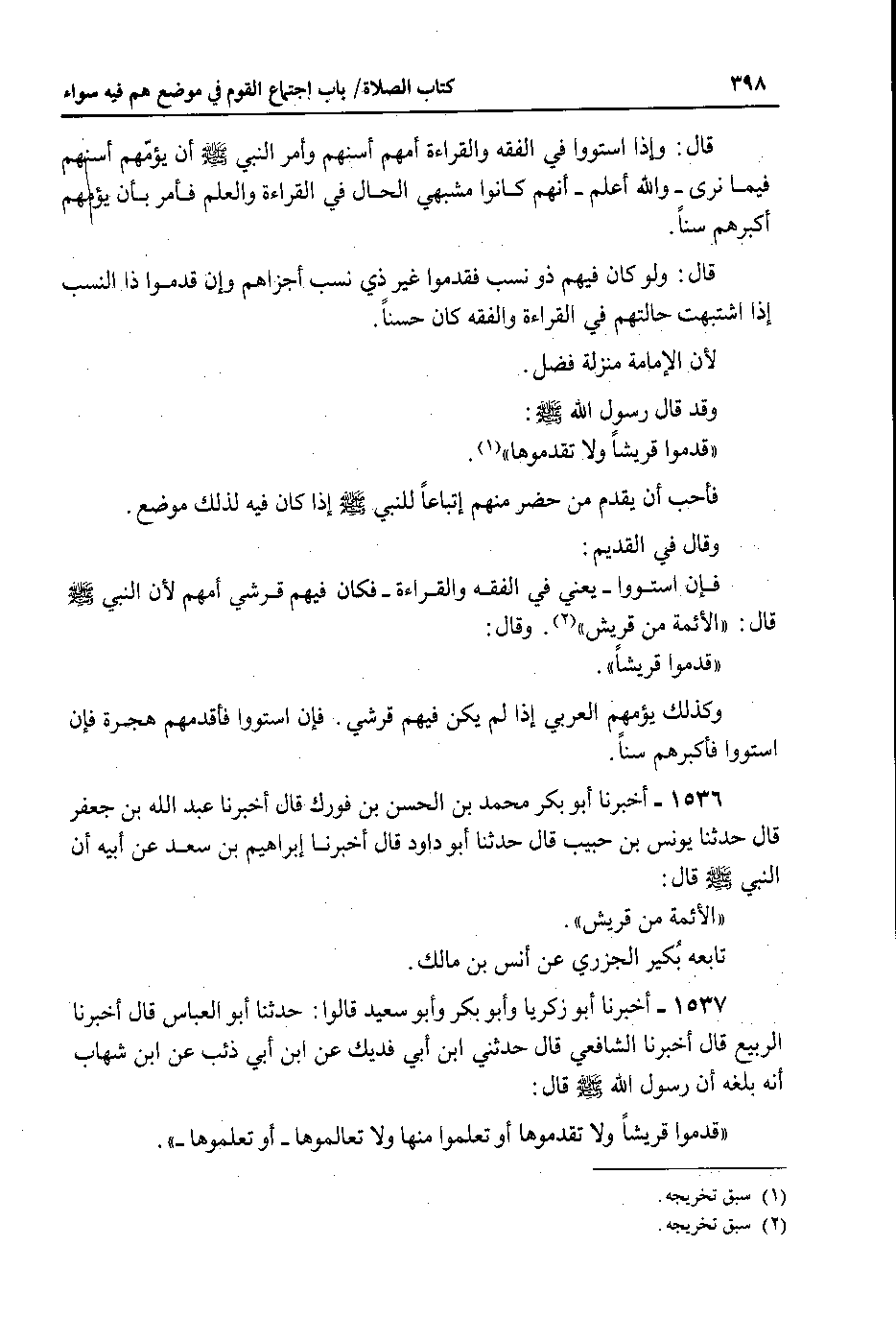 قال : وإذا استووا في الفقه والقراءة امهم أسنهم وأمر النبي صلى الله عليه وسلم أن يؤمهم اسنهم فيما نرى - والله اعلم - أنهم كانوا مشبهي الحال في القراءة والعلم فأمر بأن يؤمهم اكبرهم سنا.