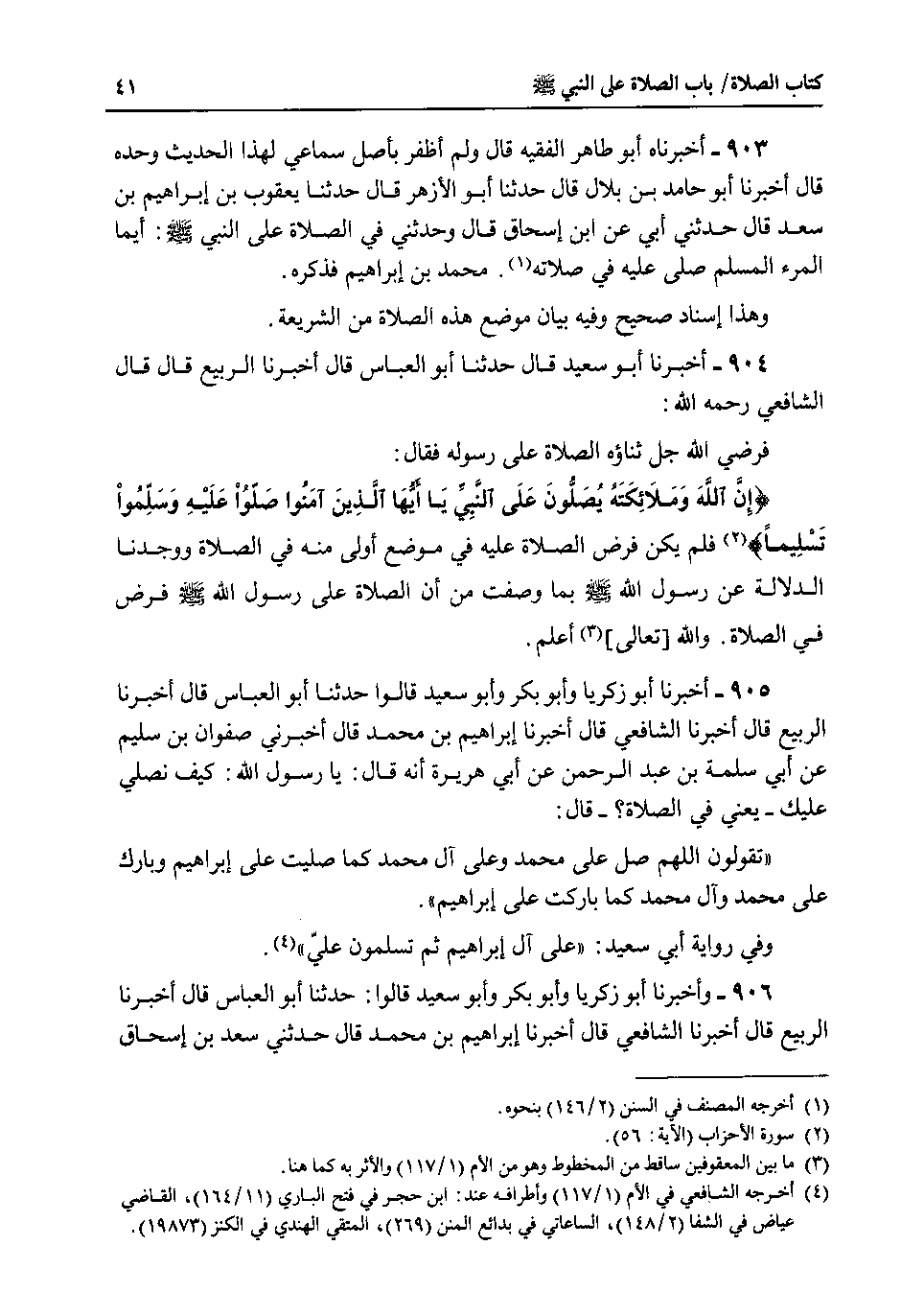 904 - اخبرنا أبو سعيد قال حدثنا أبو العباس قال اخبرنا الربيع قال قال الشافعي رحمه الله : فرضي الله جل ثناؤه الصلاة على رسوله فقال : {إن الله وملائكته يصلون على النبي يا أيها الذين آمنوا صلوا عليه وسلموا تسليما} فلم يكن فرض الصلاة عليه في موضع أولى منه في الصلاة ووجدنا الدلالة عن رسول الله صلى الله عليه وسلم بما وصفت من أن الصلاة على رسول الله صلى الله عليه وسلم فرض في الصلاة . والله تعالى أعلم.
