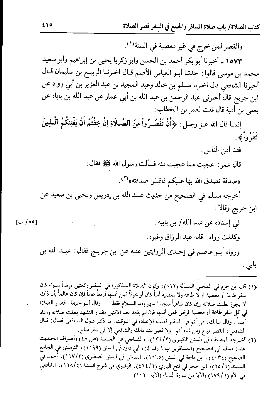 1573 - أخبرنا أبو بكر أحمد بن الحسن وأبو زكريا يحيى بن إبراهيم وأبو سعيد محمد بن موسى قالوا : حدثنا أبو العباس الأصم قال أخبرنا الربيع بن سليمان قال : أَخْبَرَنَا الشافعي قال أخبرنا مسلم بن خالد وعبد المجيد بن عبد العزيز بن أبي رواد عن ابن جريج قال اخبرني عبد الرحمن بن عبد الله بن أبي عمار عن عبد الله بن باباه عن يعلى بن أمية قال قلت لعمر بن الخطاب : إنما قال الله عز وجل : {أن تقصروا من الصلاة إن خفتم أن يفتنكم الذين كفرو}.
