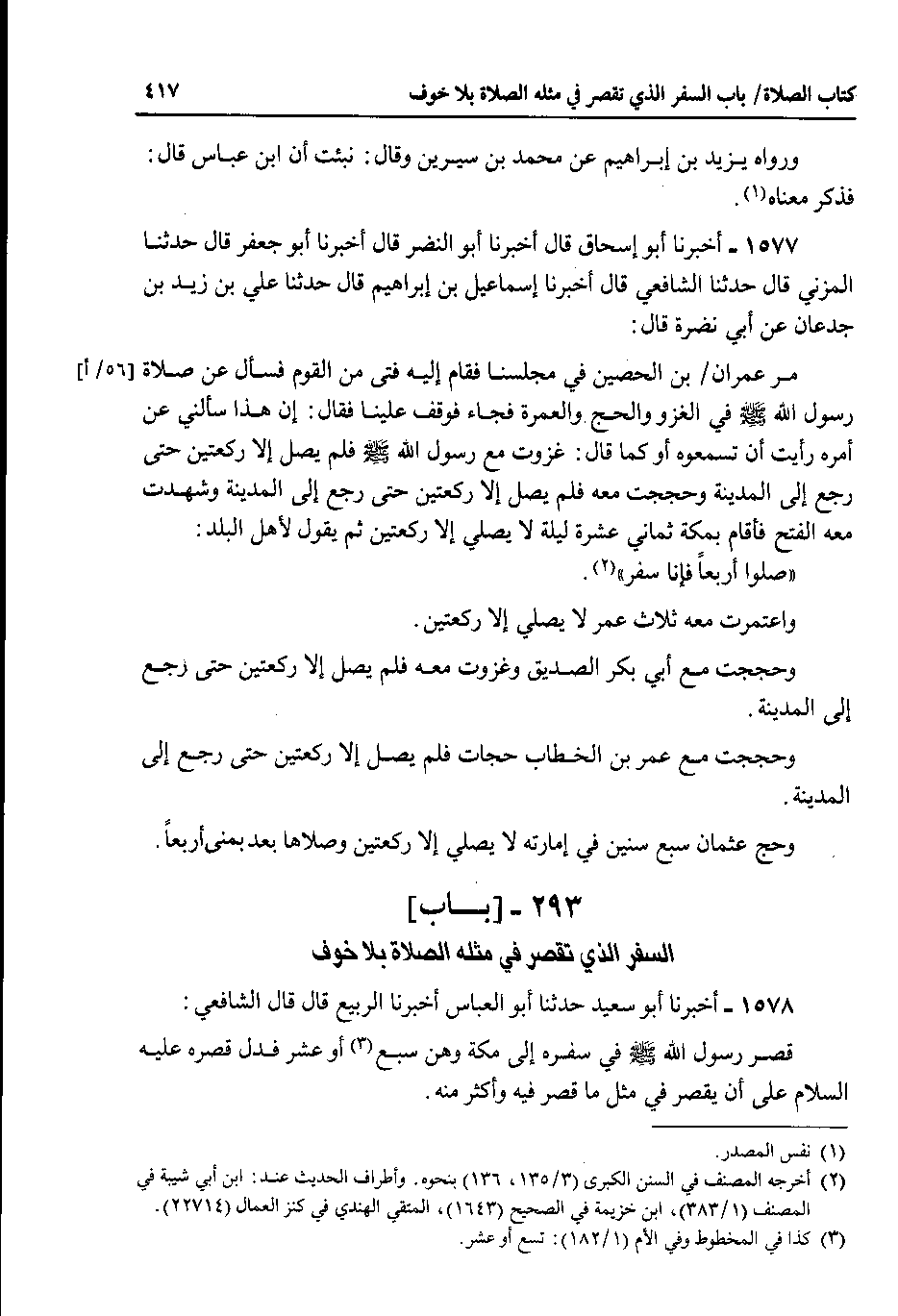 1577 - أخبرنا أبو إسحاق قال أخبرنا أبو النضر قال أخبرنا أبو جعفر قال حدثنا المزني قال حدثنا الشافعي قال أخبرنا إسماعيل بن إبراهيم قال حدثنا علي بن زيد بن جدعان عن أبي نضرة قال : مر عمران بن الحصين في مجلسنا فقام إليه فتى من القوم فسأل عن صلاة رسول الله صلى الله عليه وسلم في الغزو والحج والعمرة فجاء فوقف علينا فقال : إن هذا سألني عن أمره رأيت أن تسمعوه أو كما قال : غزوت مع رسول الله صلى الله عليه وسلم فلم يصل إلا ركعتين حتى رجع إلى المدينة وحججت معه فلم يصل إلا ركعتين حتى رجع إلى المدينة وشهدت معه الفتح فأقام بمكة ثماني عشرة ليلة لا يصلي إلى ركعتين ثم يقول لأهل البلد : صلوا اربعا فإنا سفر.