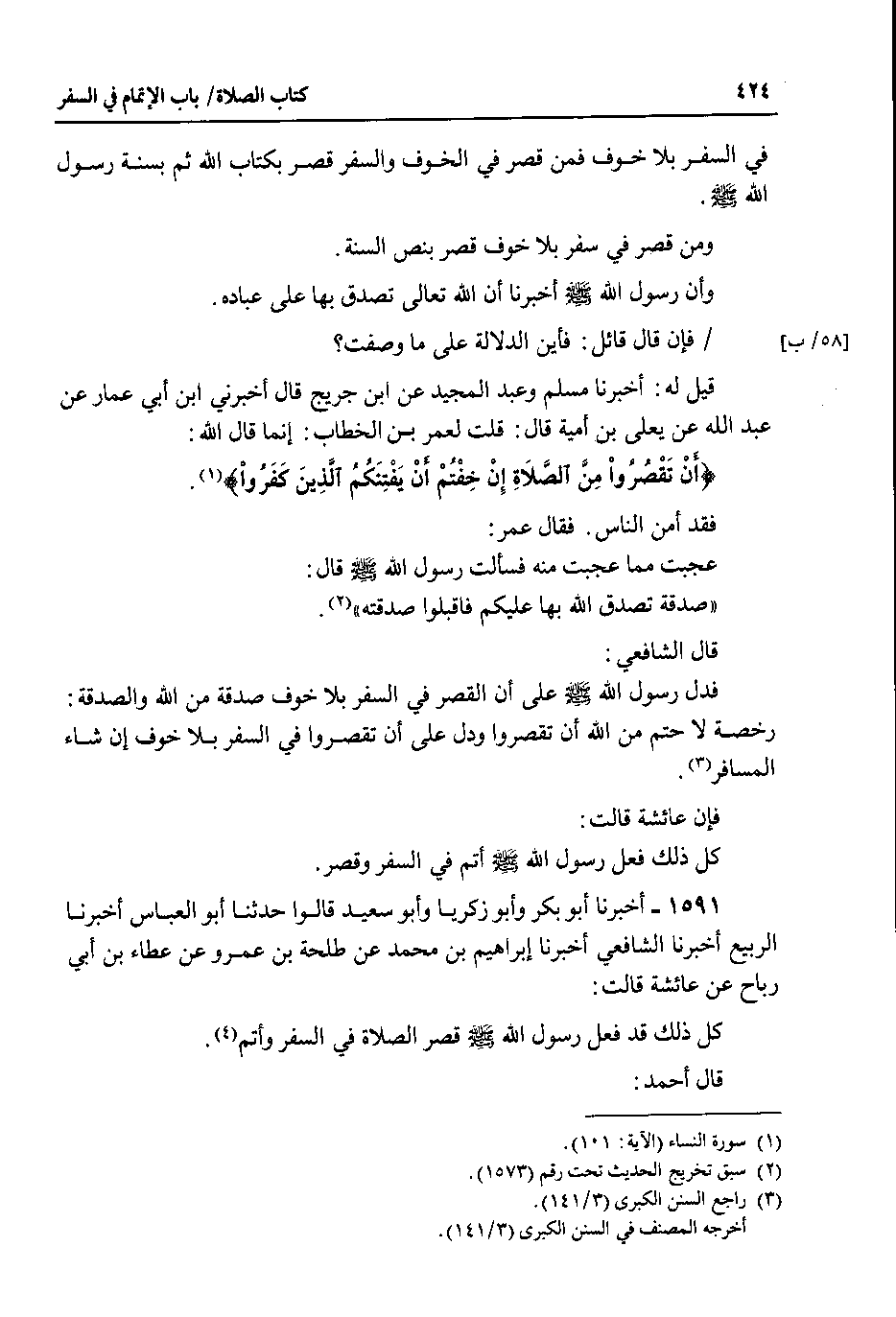 في السفر بلا خوف فمن قصر في الخوف والسفر قصر بكتاب الله ثم بسنة رسول الله صلى الله عليه وسلم.