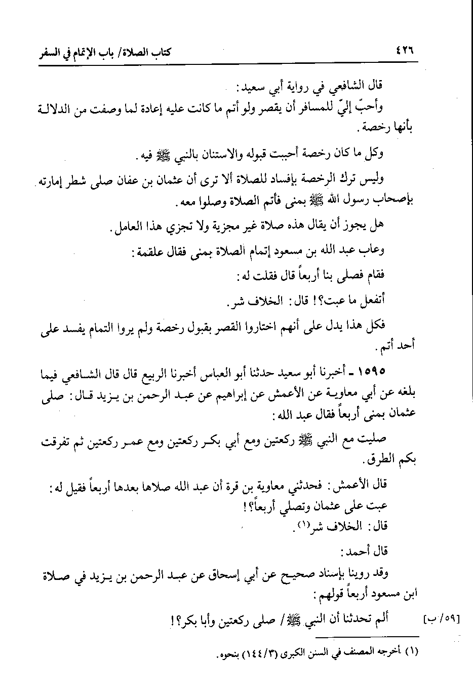 1595 - أخبرنا أبو سعيد حدثنا أبو العباس أخبرنا الربيع قال قال الشافعي فيما بلغه عن أبي معاوية عن الأعمش عن إبراهيم عن عبد الرحمن بن يزيد قال : صلى عثمان بمنى اربعا فقال عبد الله : صليت مع النبي صلى الله عليه وسلم ركعتين ومع أبي بكر ركعتين ومع عمر ركعتين ثم تفرقت بكم الطرق.
