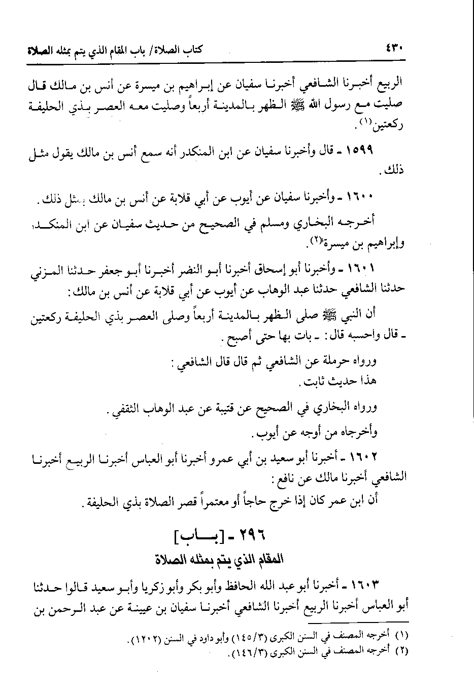 1601 - واخبرنا أبو اسحاق أخبرنا أبو النضر أخبرنا أبو جعفر حدثنا المزني حدثنا الشافعي حدثنا عبد الوهاب عن أيوب عن أبي قلابة عن أنس بن مالك : أن النبي صلى الله عليه وسلم صلى الظهر بالمدينة اربعا وصلى العصر بذي الحليفة ركعتين - قال واحسبه قال : - بات بها حتى اصبح.