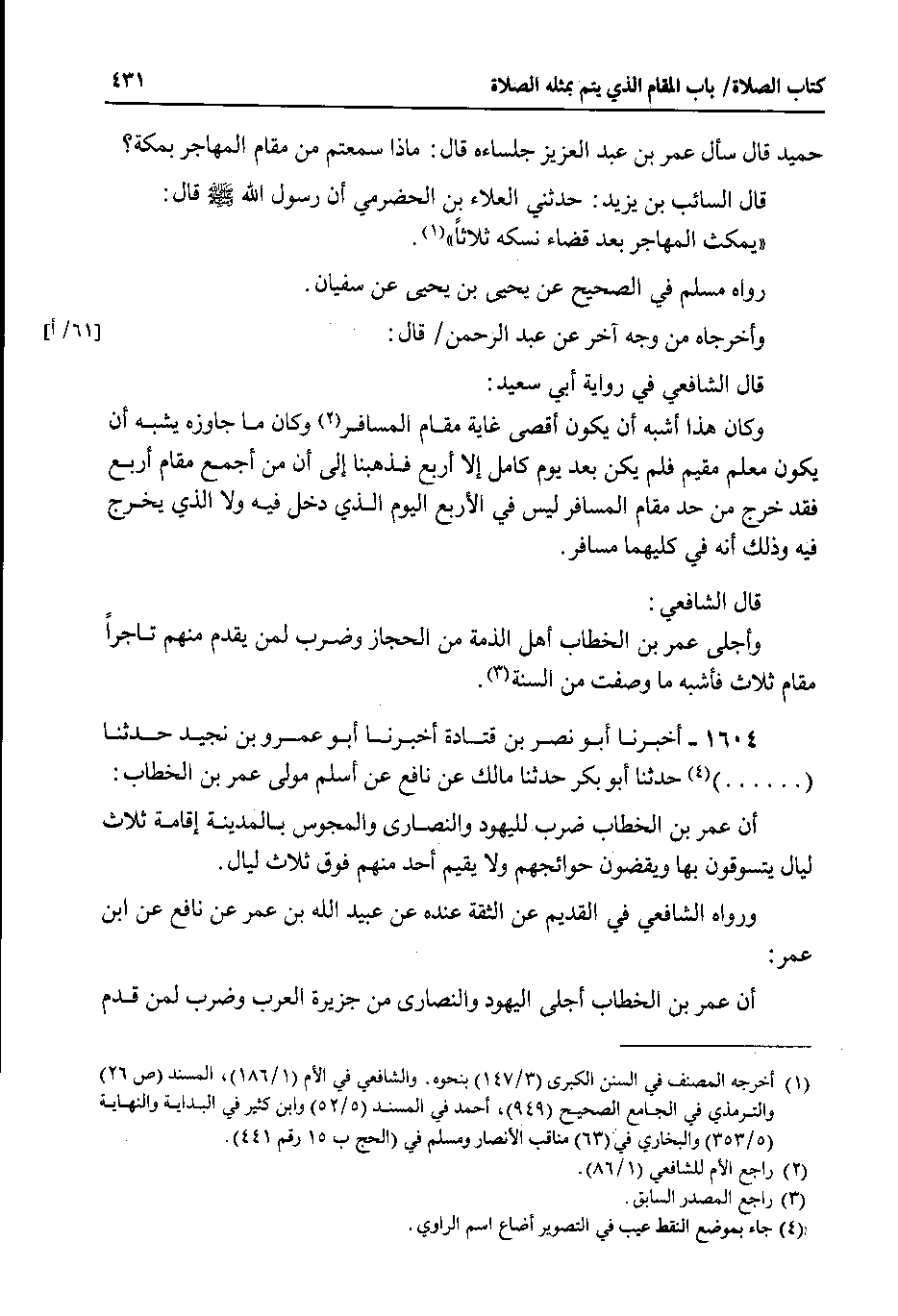 واخرجاه من وجه آخر عن عبد الرحمن قال : قال الشافعي في رواية أبي سعيد : وكان هذا أشبه أن يكون أقصى غاية مقام المسافر وكان ما جاوزه يشبه أن يكون معلم مقيم فلم يكن بعد يوم كامل إلا أربع فذهبنا إلى أن من اجمع مقام أربع فقد خرج من حد مقام المسافر ليس في الأربع اليوم الذي دخل فيه ولا الذي يخرج فيه وذلك انه في كليهما مسافر.