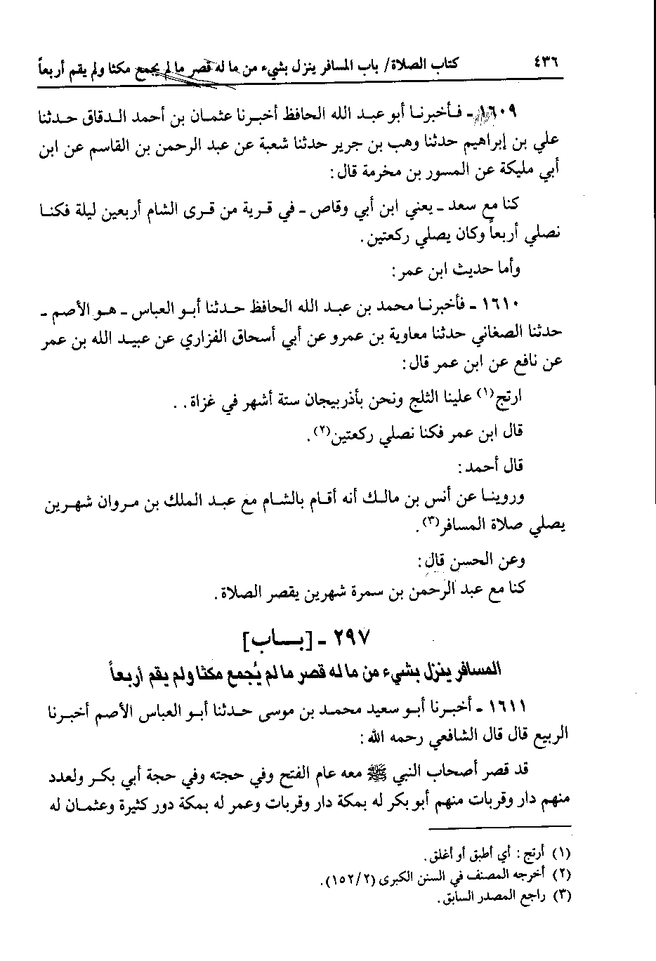 1609 - فأخبرنا أبو عبد الله الحافظ أخبرنا عثمان بن أحمد الدقاق حدثنا علي بن إبراهيم حدثنا وهب بن جرير حدثنا شعبة عن عبد الرحمن بن القاسم عن ابن أبي مليكة عن المسور بن مخرمة قال : كنا مع سعد - يعني ابن ابي وقاص - في قرية من قرى الشام أربعين ليلة فكنا نصلي اربعا وكان يصلي ركعتين.