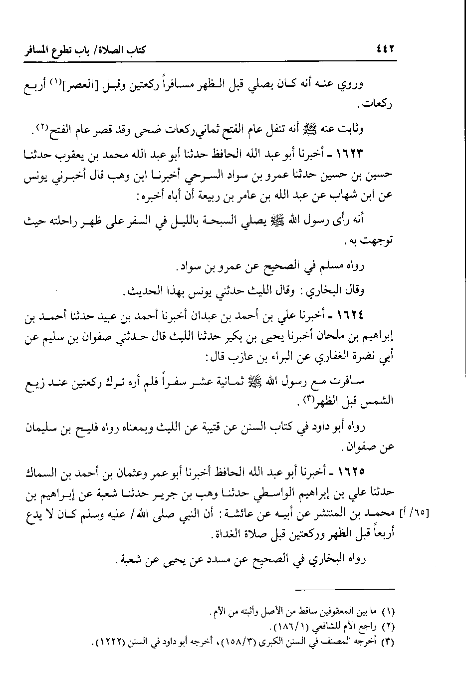 1624 - أخبرنا علي بن أحمد بن عبدان أخبرنا أحمد بن عبيد حدثنا احمد بن إبراهيم بن ملحان أخبرنا يحيى بن بكير حدثني الليث قال حدثين صفوان بن سليم عن أبي نضرة الغفاري عن البراء بن عازب قال : سافرت مع رسول الله صلى الله عليه وسلم ثمانية عشر سفرا فلم اره ترك ركعتين عند زيع الشمس قبل الظهر.