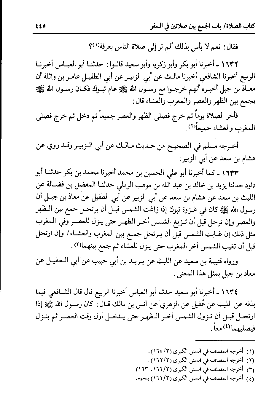 فقال : نعم لا بأس بذلك ألم تر إلى صلاة الناس بعرفة ؟ 1632 - أخبرنا أبو بكر وأبو زكريا وأبو سعيد قالوا : حدثنا أبو العباس أخبرنا الربيع أخبرنا الشافعي أخبرنا مالك عن أبي الزبير عن أبي الطفيل عامر بن واثلة أن معاذ بن جبل اخبره انهم خرجوا مع رسول الله صلى الله عليه وسلم عام تبوك فكان رسول الله صلى الله عليه وسلم يجمع بين الظهر والعصر والمغرب والعشاء قال : فأخر الصلاة يوما ثم خرج فصلى الظهر والعصر جميعا ثم دخل ثم خرج فصلى المغرب والعشاء جميعا.