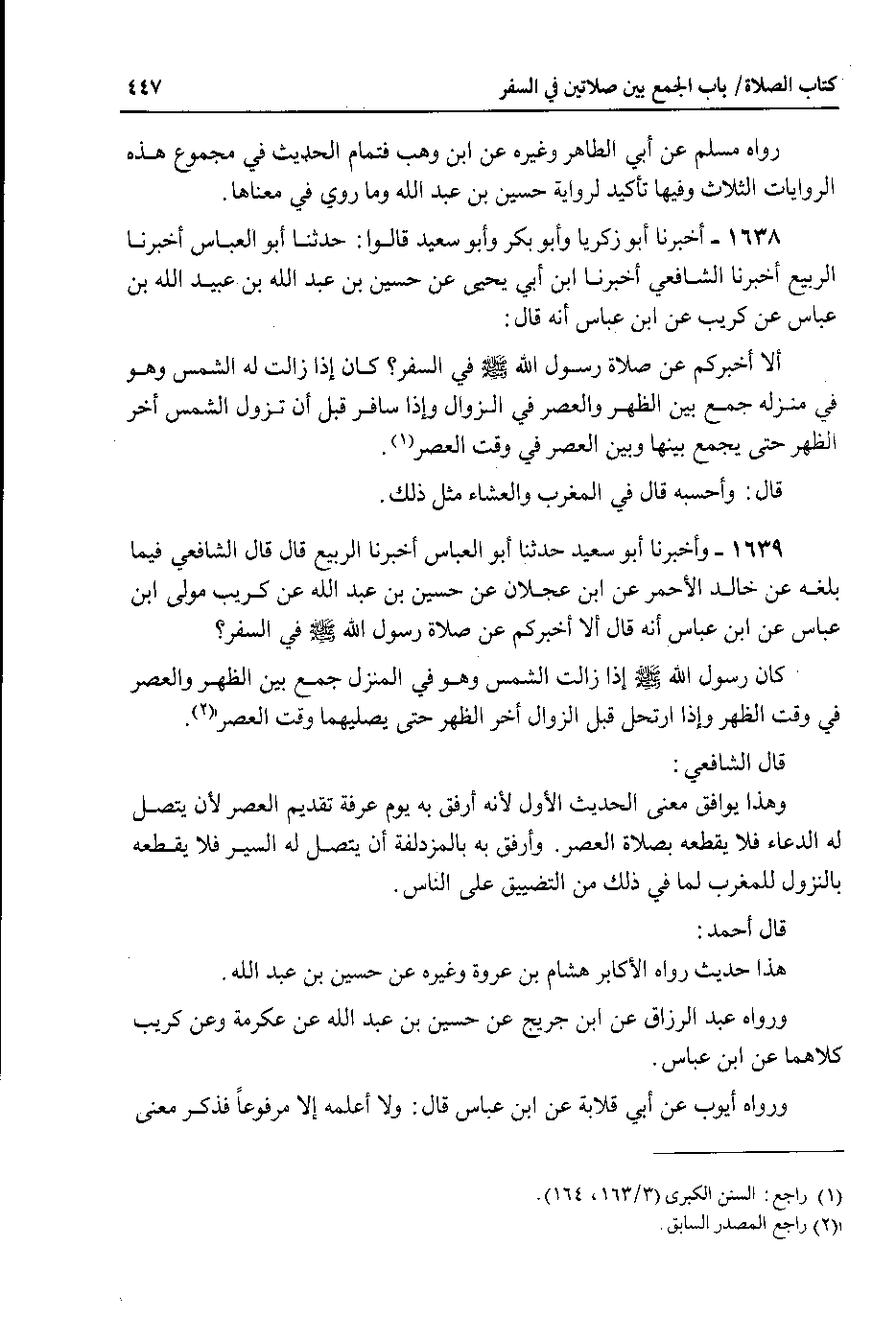 1638 - أخبرنا أبو زكريا وأبو بكر وأبو سعيد قالوا : حدثنا أبو العباس أخبرنا الربيع أخبرنا الشافعي أخبرنا ابن أبي يحيى عن حسين بن عبد الله بن عبيد الله بن عباس عن كريب عن ابن عباس انه قال : ألا اخبركم عن صلاة رسول الله صلى الله عليه وسلم في السفر ؟ كان إذا زالت له الشمس وهو في منزله جمع بين الظهر والعصر في الزوال وإذا سافر قبل أن تزول الشمس أخر الظهر حتى يجمع بينها وبين العصر في وقت العصر.