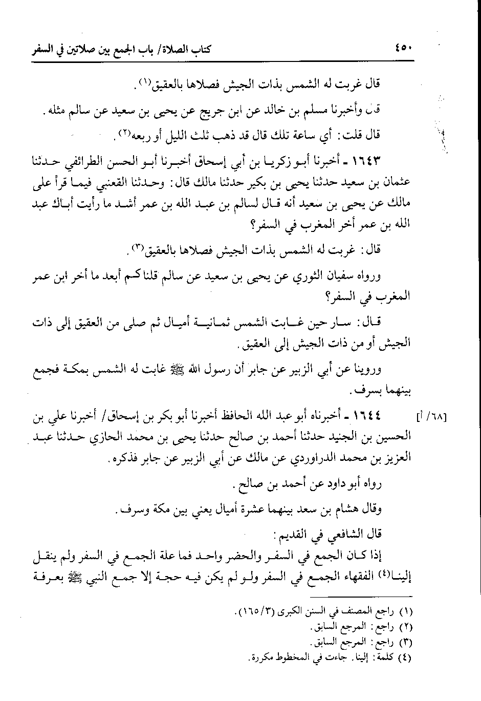 1643 - أخبرنا أبو زكريا بن أبي إسحاق أخبرنا أبو الحسن الطرائفي حدثنا عثمان بن سعيد حدثنا يحيى بن بكير حدثنا مالك قال : وحدثنا القعنبي فيما قرأ على مالك عن يحيى بن سعيد انه قال لسالم بن عبد الله بن عمر اشد ما رأيت أباك عبد الله بن عمر أخر المغرب في السفر ؟.