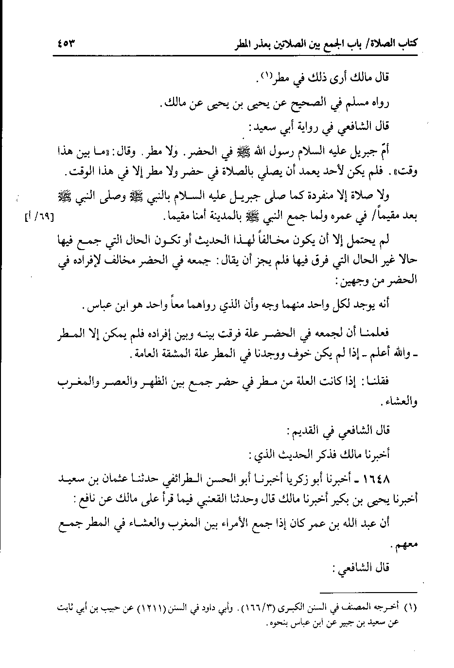 فعلمنا أن لجمعه في الحضر علة فرقت بينه وبين إفراده فلم يمكن إلا المطر - والله أعلم - إذا لم يكن خوف ووجدنا في المطر علة المشقة العامة.