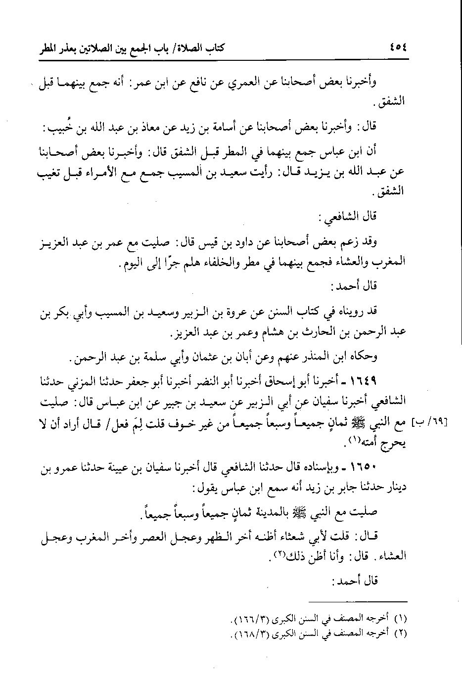 قال : واخبرنا بعض أصحابنا عن أسامة بن زيد عن معاذ بن عبد الله بن خبيب : أن ابن عباس جمع بينهما في المطر قبل الشفق قال : واخبرنا بعض أصحابنا عن عبد الله بن يزيد قال : رأيت سعيد بن المسيب جمع مع الأمراء قبل تغيب الشفق.