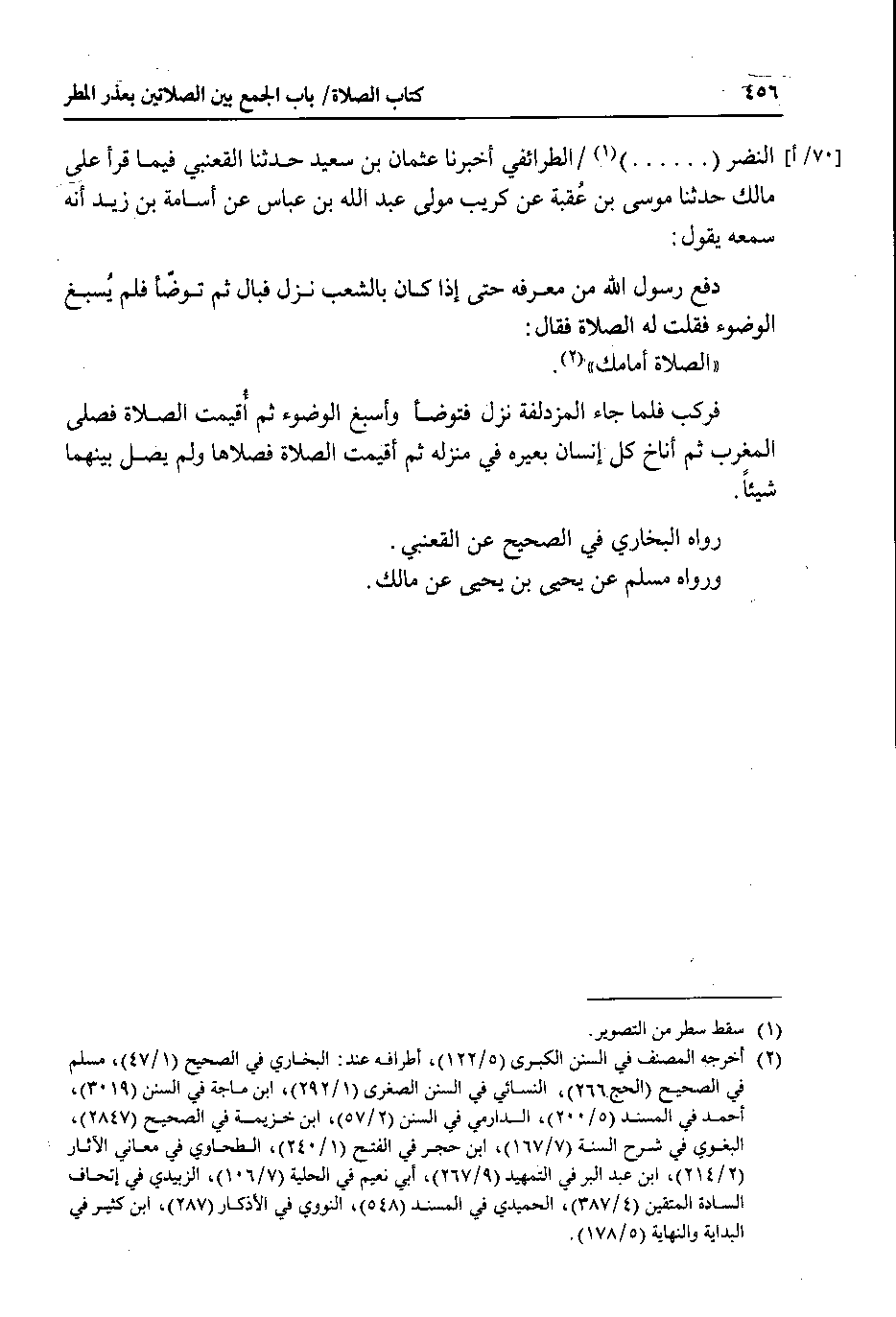 النضر ( . . . . . . ) الطرائفي أخبرنا عثمان بن سعيد حدثنا القعنبي فيما قرأ على مالك حدثنا موسى بن عقبة عن كريب مولى عبد الله بن عباس عن أسامة بن زيد أنه سمعه يقول : دفع رسول الله من معرفه حتى إذا كان بالشعب نزل فبال ثم توضأ فلم يسبغ الوضوء فقلت له الصلاة فقال : الصلاة امامك.