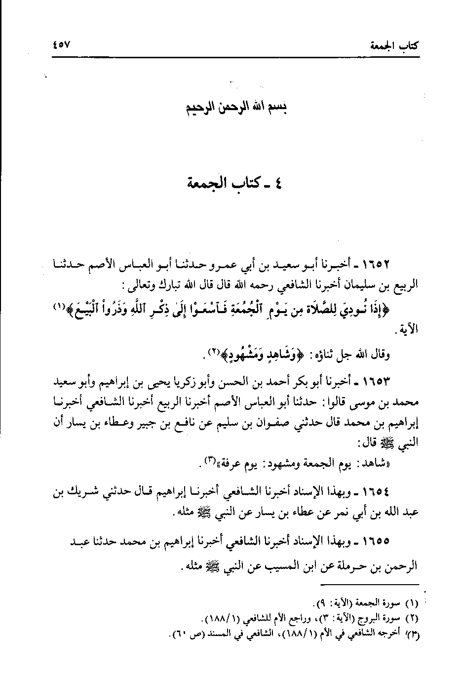 1652 - أخبرنا أبو سعيد بن أبي عمرو حدثنا أبو العباس الأصم حدثنا الربيع بن سليمان أخبرنا الشافعي رحمه الله قال قال الله تبارك وتعالى : {إذا نودي للصلاة من يوم الجمعة فاسعوا إلى ذكر الله وذروا البيع} الآية.