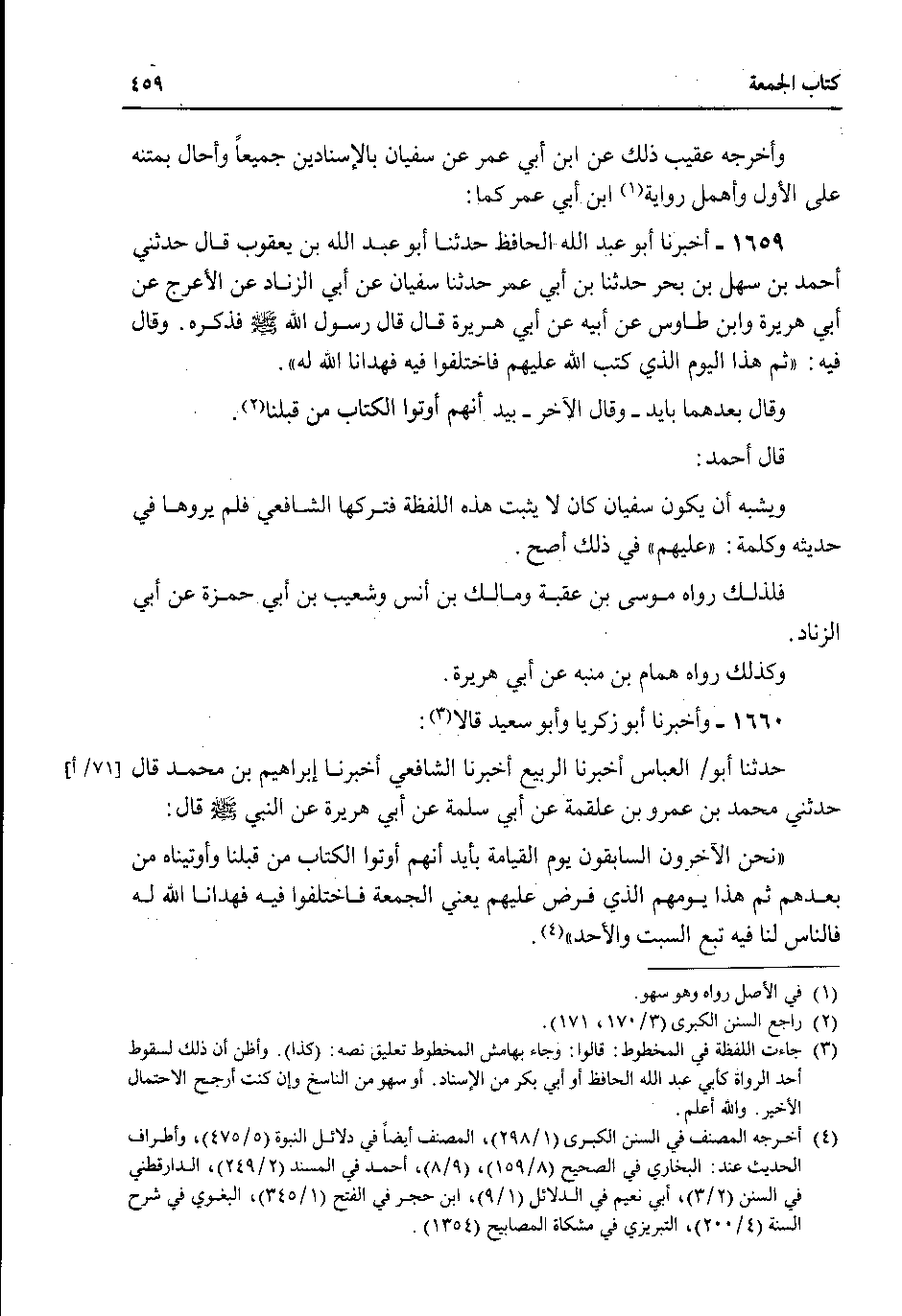 وأخرجه عقيب ذلك عن ابن أبي عمر عن سفيان بالإسنادين جميعا وأحال بمتنه على الأول واهمل رواية ابن أبي عمر كما 1659 - أخبرنا أبو عبد الله الحافظ حدثنا أبو عبد الله بن يعقوب قال حدثني أحمد بن سهل بن بحر حدثنا بن أبي عمر حدثنا سفيان عن أبي الزناد عن الأعرج عن أبي هريرة وابن طاووس عن ابيه عن أبي هريرة قال قال رسول الله صلى الله عليه وسلم فذكره . وقال فيه : ثم هذا اليوم الذي كتب الله عليهم فاختلفوا فيه فهدانا الله له.