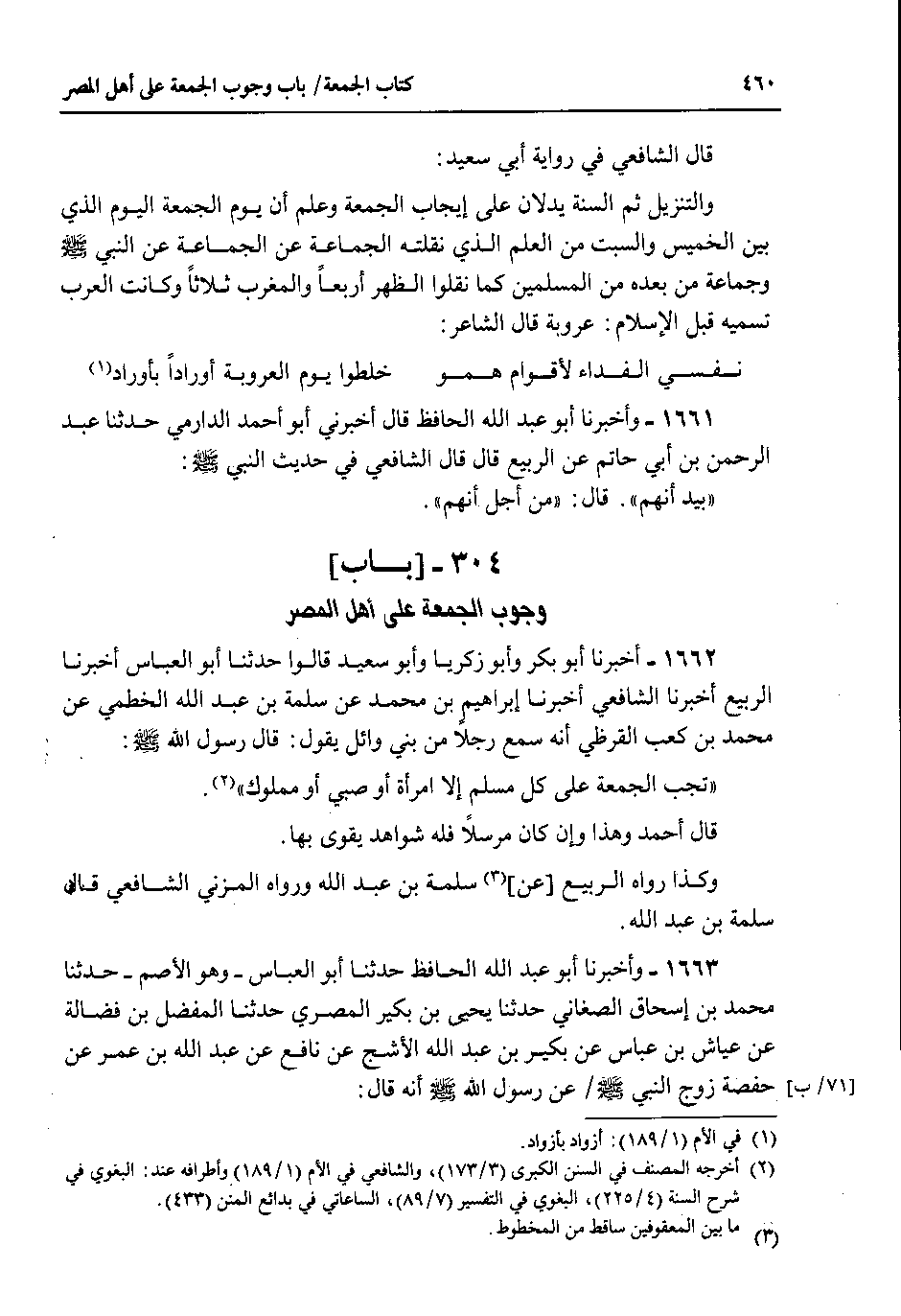 قال الشافعي في رواية أبي سعيد : والتنزيل ثم السنة يدلان على ايجاب الجمعة وعلم أن يوم الجمعة اليوم الذي بين الخمس والسبت من العلم الذي نقلته الجماعة عن الجماعة عن النبي صلى الله عليه وسلم وجماعة من بعده من المسلمين كما نقلوا الظهر أربعا والمغرب ثلاثا وكانت العرب تسميه قبل الإسلام : عروبة قال الشاعر % ( نفسي الفداء لأقوام همو % خلطوا يوم العروبة اورادا بأوراد ) % 1661 - واخبرنا أبو عبد الله الحافظ قال اخبرني أبو أحمد الدارمي حدثنا عبد الرحمن بن أبي حاتم عن الربيع قال قال الشافعي في حديث النبي صلى الله عليه وسلم : بيد انهم . قال : من اجل انهم .