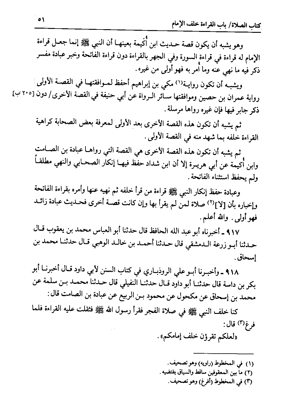 918 - واخبرنا أبو علي الروذباري في كتاب السنن لابي داود قال اخبرنا أبو بكر بن داسة قال حدثنا أبو داود قال حدثنا النفيلي قال حدثنا محمد بن سلمة عن محمد بن إسحاق عن مكحول عن محمود بن الربيع عن عبادة بن الصامت قال : كنا خلف النبي صلى الله عليه وسلم في صلاة الفجر فقرأ رسول الله صلى الله عليه وسلم فثقلت عليه القراءة فلما فرغ قال : لعلكم تقرؤن خلف إمامكم.