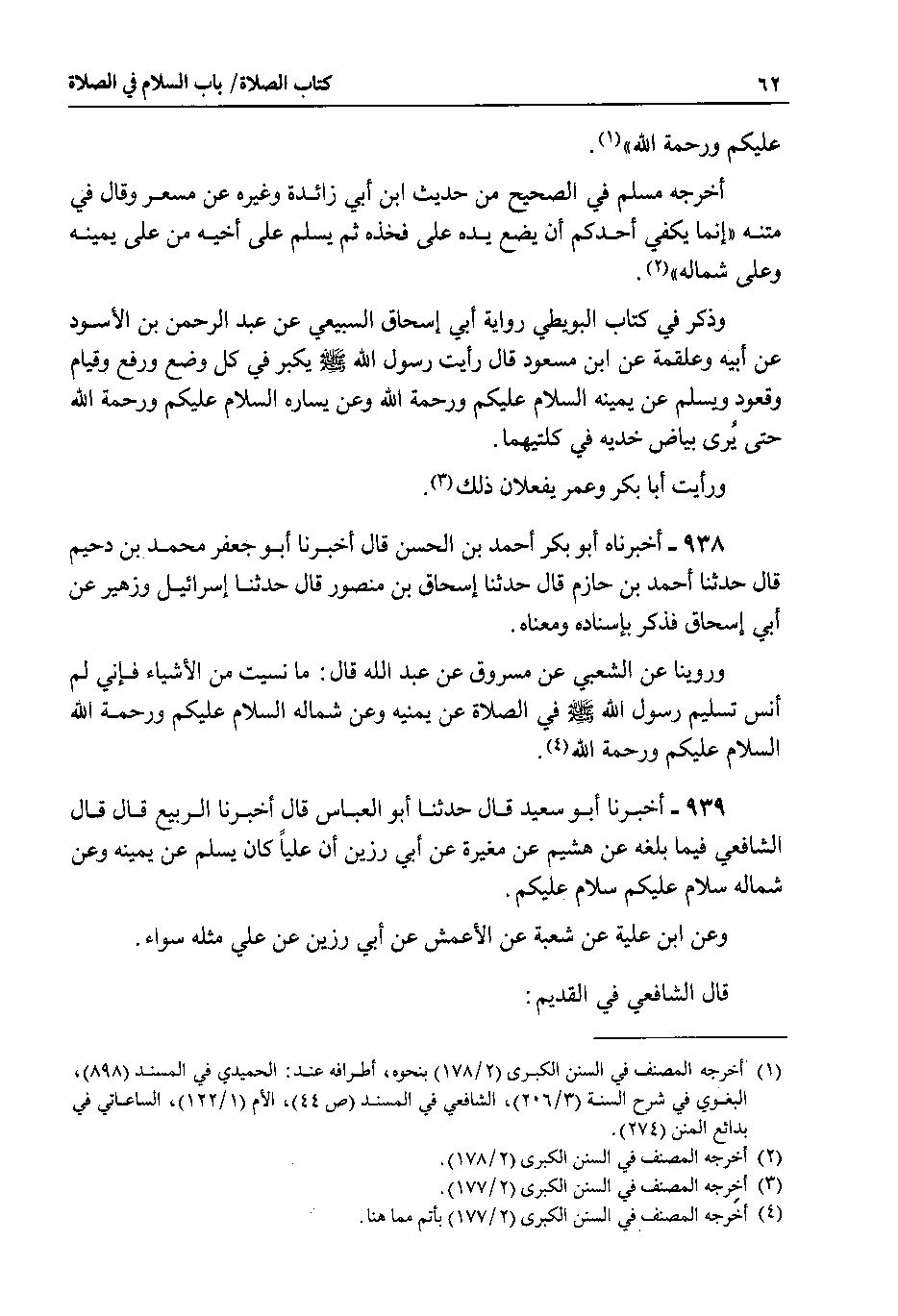 وذكر في كتاب البويطي رواية أبي إسحاق السبيعي عن عبد الرحمن بن الأسود عن أبيه وعلقمة عن ابن مسعود قال رأيت رسول الله صلى الله عليه وسلم يكبر في كل وضع ورفع وقيام وقعود ويسلم عن يمينه السلام عليكم ورحمة الله وعن يساره السلام عليكم ورحمة الله حتى يرى بياض خديه في كلتيهما.