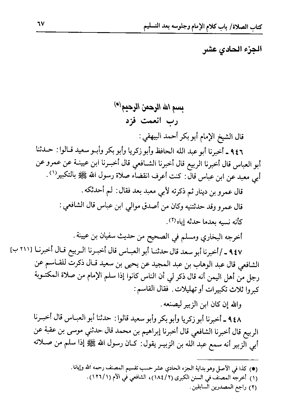 الجزء الحادي عشر بسم الله الرحمن الرحيم رب انعمت فزد قال الشيخ الإمام أبو بكر أحمد البيهقي 946 - اخبرنا أبو عبد الله الحافظ وأبو زكريا وأبو بكر وأبو سعيد قالوا : حدثنا أبو العباس قال اخبرنا الربيع قال اخبرنا الشافعي قال اخبرنا ابن عيينة عن عمرو عن أبي معبد عن ابن عباس قال : كنت اعرف انقضاء صلاة رسول الله صلى الله عليه وسلم بالتكبير.