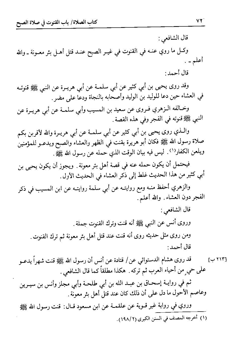 قال أحمد : قد روى هشام الدستوائي عن قتادة عن انس أن رسول الله صلى الله عليه وسلم قنت شهرا يدعو على حي من احياء العرب ثم تركه . هكذا مطلقا كما قال الشافعي.