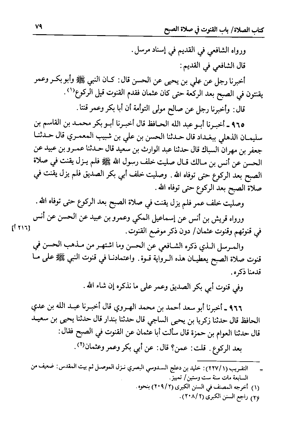 965 - اخبرنا أبو عبد الله الحافظ قال اخبرنا أبو بكر محمد بن القاسم بن سليمان الذهلي ببغداد قال حدثنا الحسن بن علي بن شبيب المعمري قال حدثنا جعفر بن مهران السباك قال حدثنا عبد الوارث بن سعيد قال حدثنا عمرو بن عبيد عن الحسن عن انس بن مالك قال صليت خلف رسول الله صلى الله عليه وسلم فلم يزل يقنت في صلاة الصبح بعد الركوع حتى توفاه الله . وصليت خلف أبي بكر الصديق فلم يزل يقنت في صلاة الصبح بعد الركوع حتى توفاه الله.