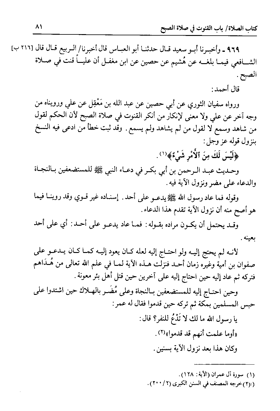 قال أحمد : ورواه سفيان الثوري ، عَنْ أَبِي حَصِينٍ ، عن عبد الله بن معقل عن علي ورويناه من وجه آخر عن علي ولا معنى لإنكار من أنكر القنوت في صلاة الصبح لأن الحكم لقول من شاهد وسمع لا لقول من لم يشاهد ولم يسمع . وقد ثبت خطأ من ادعى فيه النسخ بنزول قوله عز وجل : {ليس لك من الأمر شيء} وحديث عبد الرحمن بن أبي بكر في دعاء النبي صلى الله عليه وسلم للمستضعفين بالنجاة والدعاء على مضر ونزول الآية فيه.