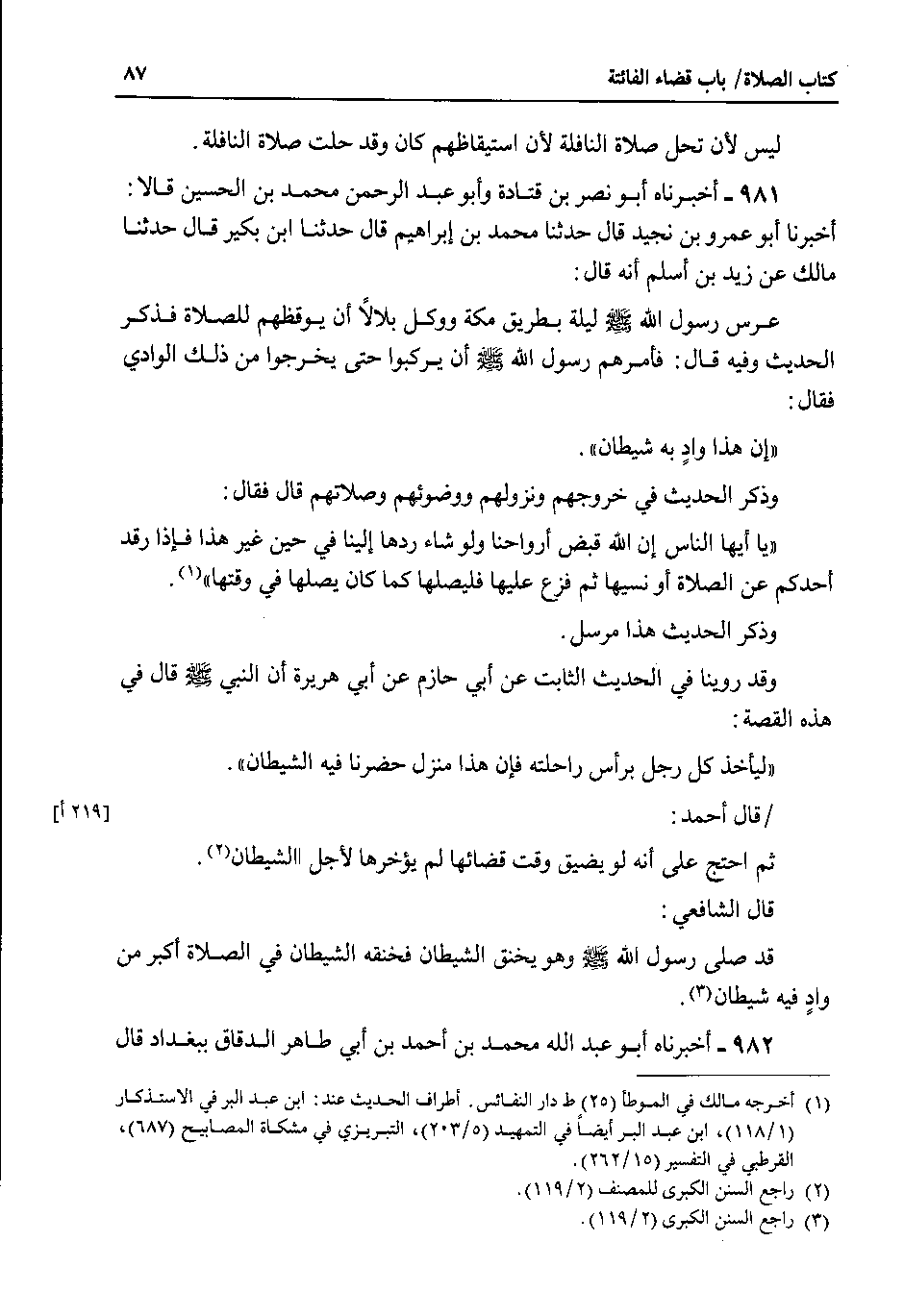 981 - أخبرناه أبو نصر بن قتادة وأبو عبد الرحمن محمد بن الحسين قالا : اخبرنا أبو عمرو بن نجيد قال حدثنا محمد بن إبراهيم قال حدثنا ابن بكير قال حدثنا مالك عن زيد بن اسلم انه قال : عرس رسول الله صلى الله عليه وسلم ليلة بطريق مكة ووكل بلالا أن يوقظهم للصلاة فذكر الحديث وفيه قال : فأمرهم رسول الله صلى الله عليه وسلم أن يركبوا حتى يخرجوا من ذلك الوادي فقال إن هذا واد به شيطان.