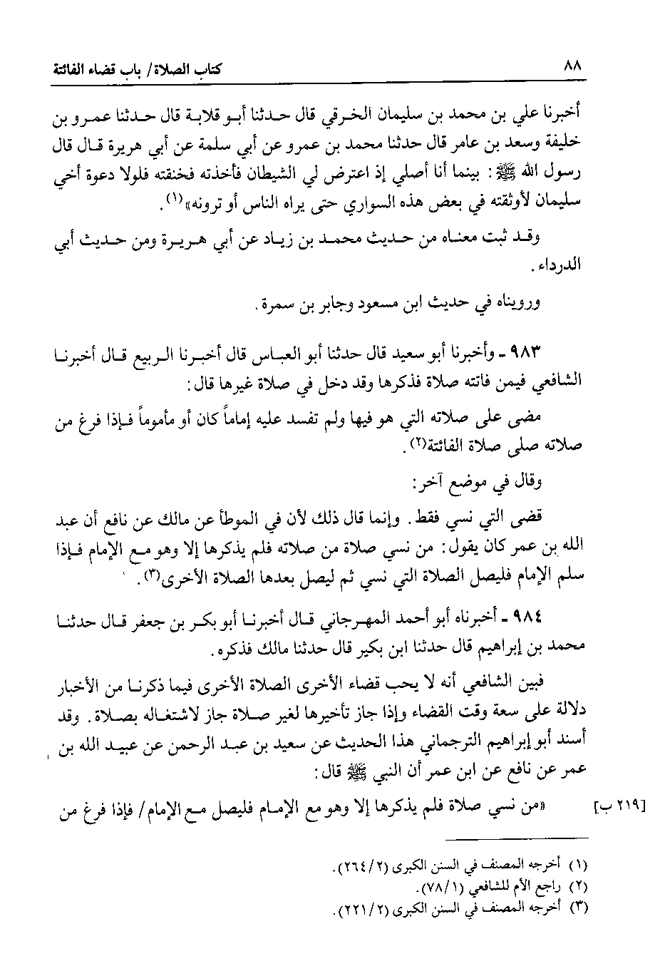 983 - واخبرنا أبو سعيد قال حدثنا أبو العباس قال اخبرنا الربيع قال اخبرنا الشافعي فيمن فاتته صلاة فذكرها وقد دخل في صلاة غيرها قال : مضى على صلاته التي هو فيها ولم تفسد عليه إماما كان أو مأموما فإذا فرغ من صلاته صلى صلاة الفائتة.