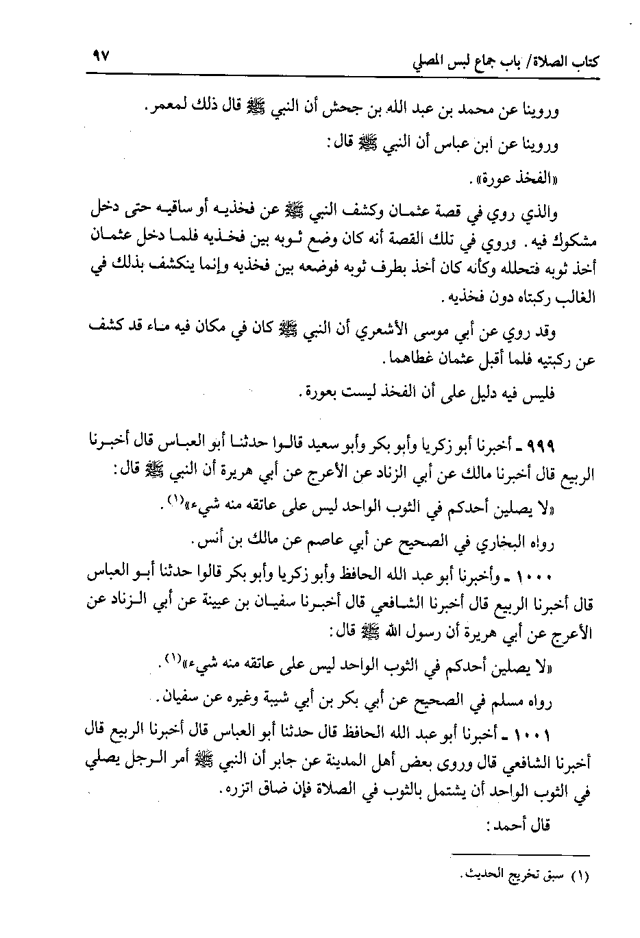 999 - اخبرنا أبو زكريا وأبو بكر وأبو سعيد قالوا حدثنا أبو العباس قال اخبرنا الربيع قال اخبرنا مالك عن أبي الزناد عن الأعرج عن أبي هريرة أن النبي صلى الله عليه وسلم قال : لا يصلين أحدكم في الثوب الواحد ليس على عاتقه منه شي.